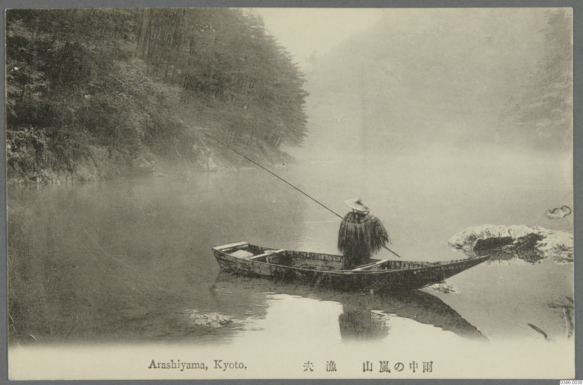 Vykort med motiv av man, med stråhatt och utsyrsel i bast, hållandes ett spö, i båt på stilla vatten invid kanten av skog, dimma i horisonten. Vy från Arashiyama, Kyoto, Japan. Text på framsida: "Arashiyama, Kyoto, Text på annat språk." Text på baksida: "CARTE POSTALE, Text på annat språk."