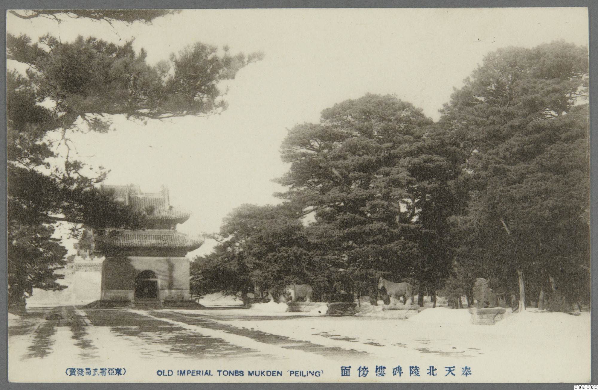 Vykort med motiv av väg som leder fram till en byggnad i bakgrunden, träd vid sidan av, djurstatyer upphöjda av stenstodar. Gamla kejserliga gravar, Shenyang, Kina. Text på framsida: "Text på annat språk, OLD IMPERIAL TONBS MUKDEN PEILING, Text på annat språk." Text på baksida: "CARTE POSTALE, UNION POSTALE UNIVERSELLE. Text på annat språk."