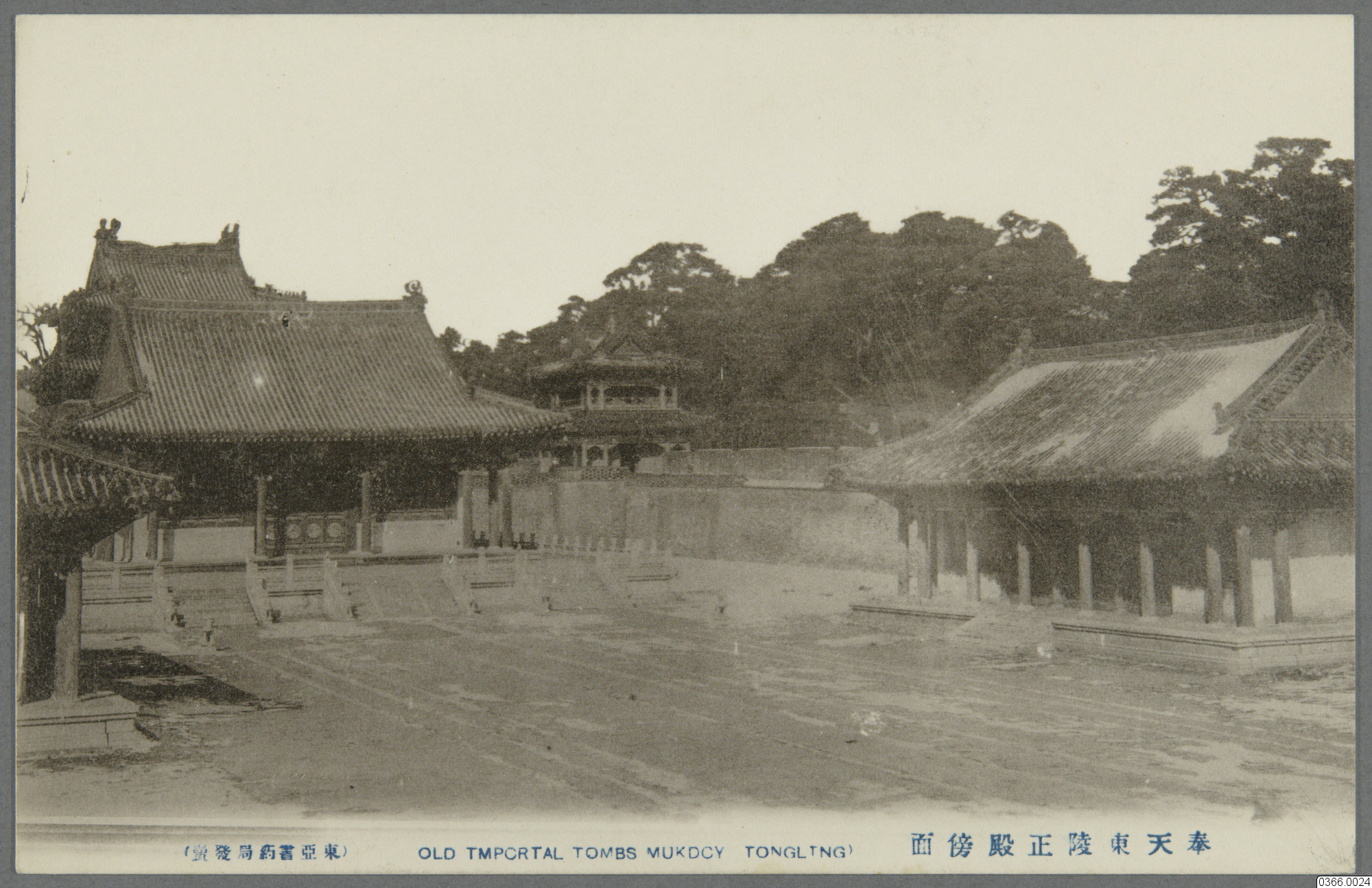 Vykort med motiv av gamla gravbyggnader, öppen gård i förgrunden, träd i bakgrunden. Tongling, Kina. Text på framsida: "Text på annat språk, OLD TMPCRTAL TOMBS MUKDCY TONGLING, Text på annat språk." Text på baksida: "CARTE POSTALE, UNION POSTALE UNIVERSELLE. Text på annat språk."
