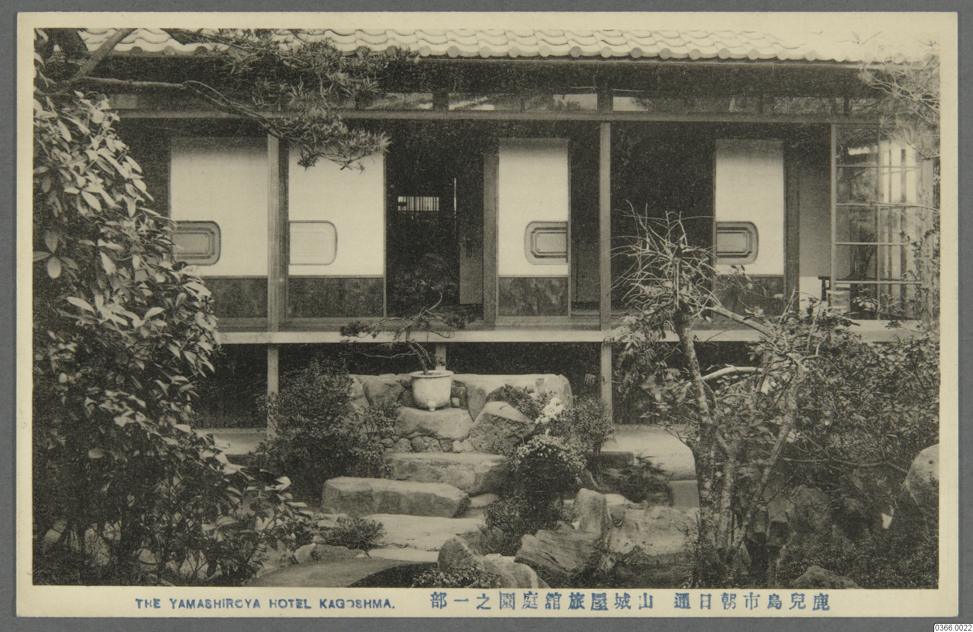 Vykort med motiv av trädgård i förgrunden, trappa, med krukväxt, som leder upp till byggnad med öppna dörrar i bakgrunden, del utav Hotellet Yamashiroya i Kagoshima, Japan. Text på framsida: "THE YAMASHIROYA HOTEL KAGOSHIMA. Text på Japanska." Text på baksida: "UNION POSTALE UNIVERSELLE. CARTE POSTALE, Text på Japanska."