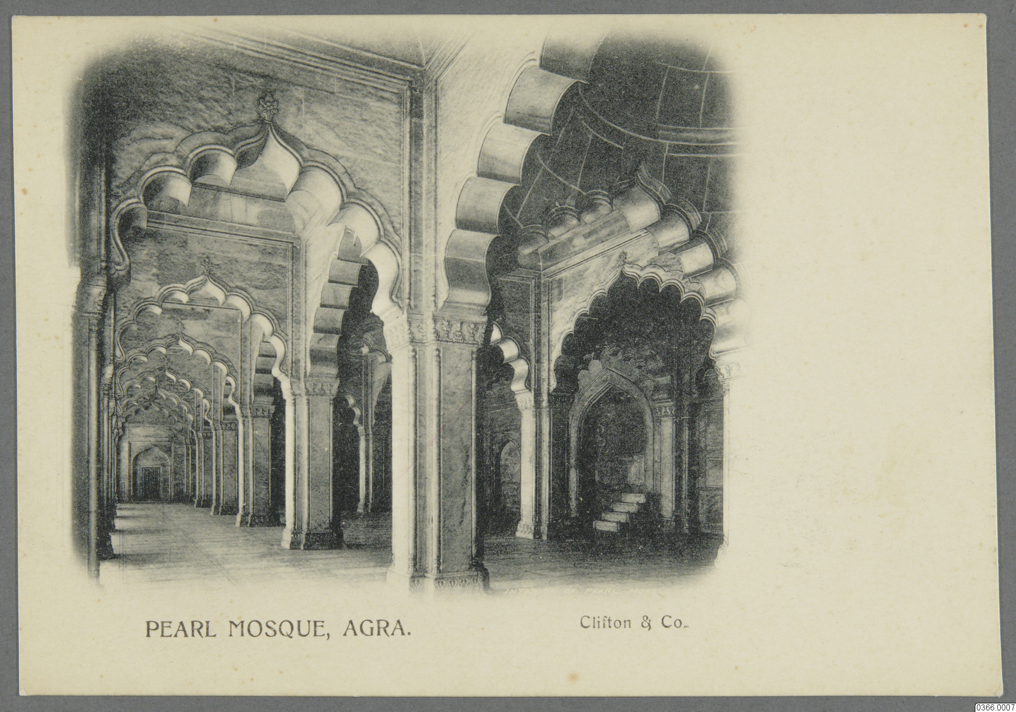 Vykort med motiv av insidan av en moské, volangliknande former följer öppningarna i byggnaden. Moské i Röda Fortet kallad Pärlmoskén eller Moti Masjid, gjort helt i vit marmor. Agra, Uttar Pradesh, Indien. Text på framsida: "PEARL MOSQUE, AGRA. Clifton & Co." Text på baksida: "UNIVERSAL POSTAL UNION - UNION POSTALE UNIVERSELLE, BRITISH INDIA, INDE BRITANNIQUE, POST CARD - CARTE POSTALE, THE ADDRESS ONLY TO BE WRITTEN ON THIS SIDE."