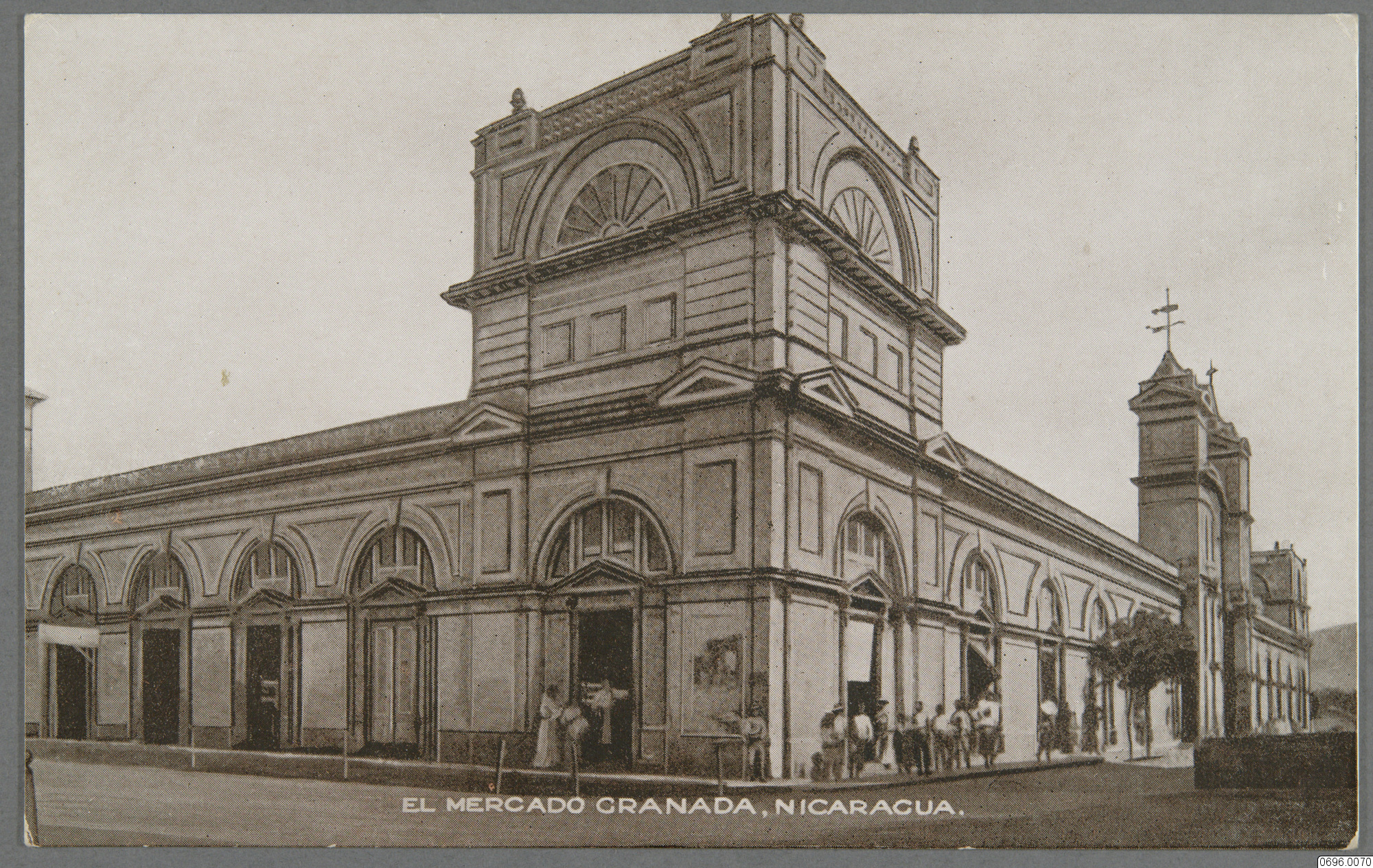 Vykort med motiv av kantig byggnad med högre mittenparti som sticker upp, torn på byggnaden i bakgrunden, människor vid sidan av byggnaden - speciellt vid ingångar. Granadamarknaden i Nicaragua. Amerika. Text på framsida: "EL MERCADO GRANADA, NICARAGUA." Text på baksida: "NICARAGUA, TARJETA POSTAL, POST CARD, CARTE POSTALE, CARTOLINA POSTALE, Text på annat språk."