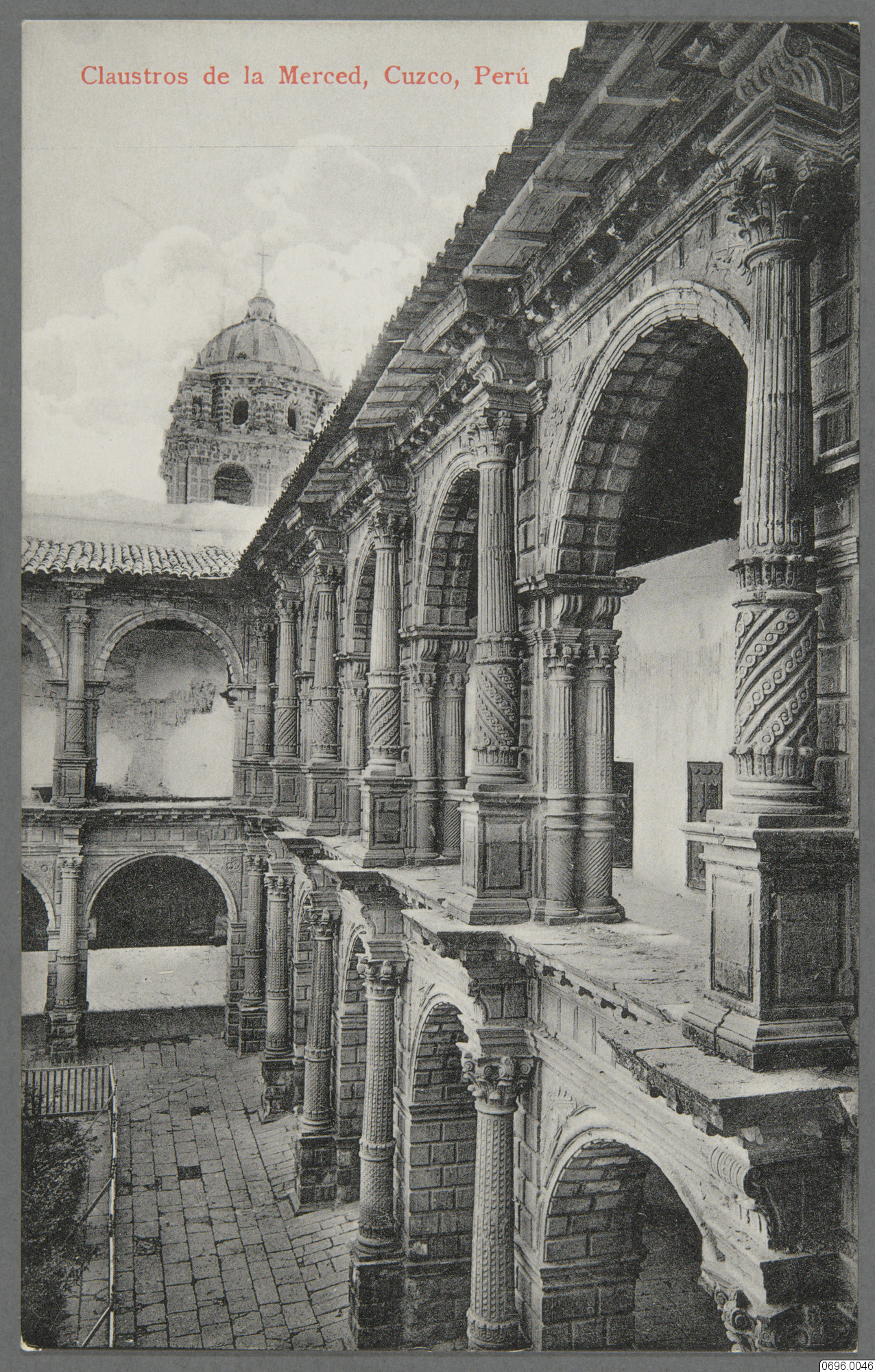 Vykort med motiv av två våningar, båda med stengolv och dekorativa kolonner med snirkliga samt randiga mönster, valv, väggar innanför kolonnerna, trädörrar på andra våningen, torn skymtar i bakgrunden. Del utav La Merceds kyrka. Cusco, Peru, Amerika Text på framsida: "Claustros de la Merced, Cuzco, Perú." Text på baksida: "UNION POSTALE UNIVERSELLE, Tarjeta Postal - Carte Postale, Edicion propia de Max T. Vargas, Arequipa, y La Paz. Printed in Germany. 188491."