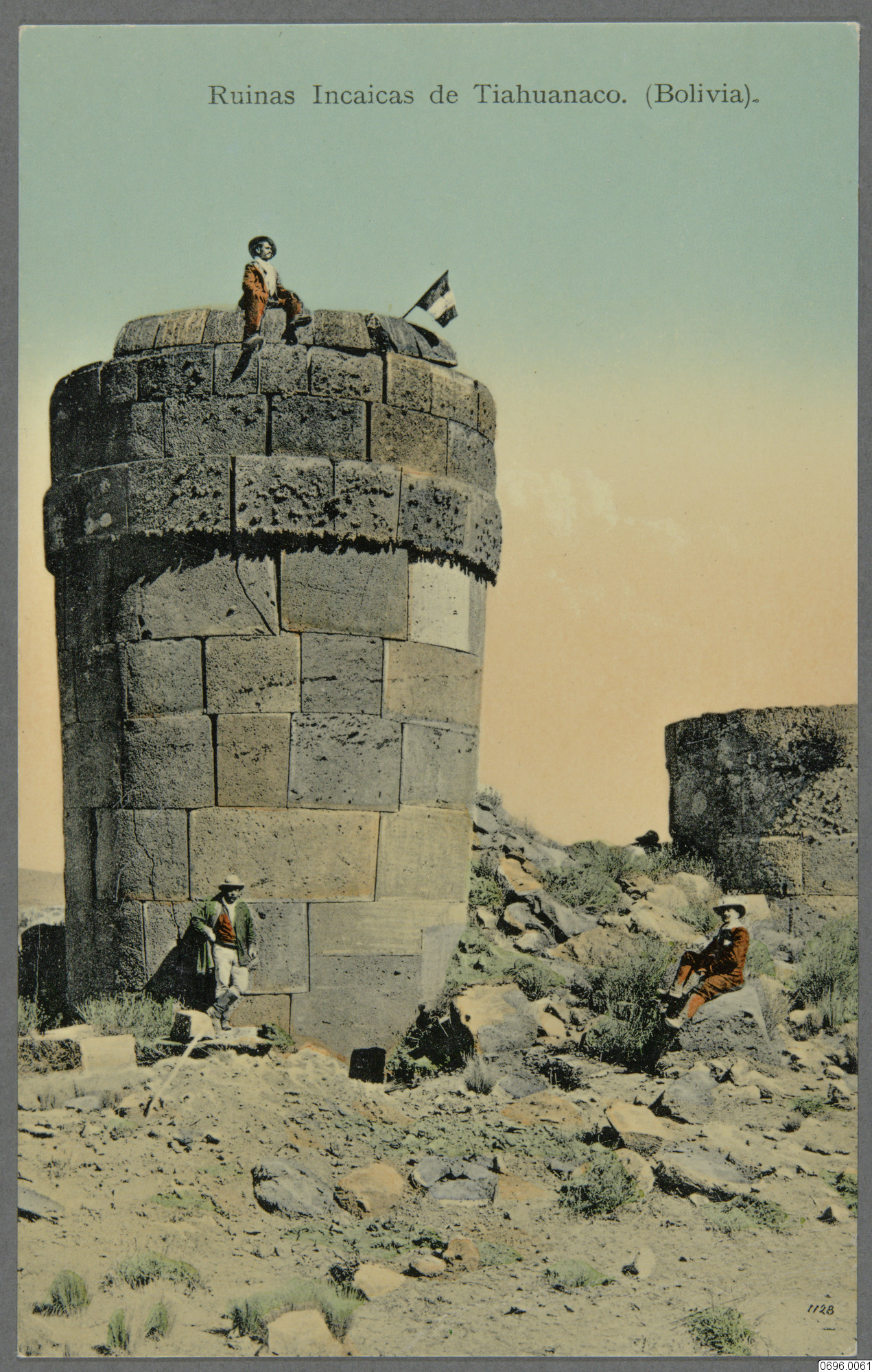 Vykort med kolorerad bild av tre män poserandes på - och vid uppresta tornliknande stenbyggnader i sten, flagga i topp av byggnaden en av männen sitter på, utspridda stenar och växtlighet i förgrunden. Chullpas (gravar). Tiwanaku, Bolivia, Amerika. Text på framsida: "Ruinas Incaicas de Tiahuanaco (Bolivia.)" Text på baksida: "UNION POSTALE UNIVERSELLE, Carte postale - Tarjeta Postal, Correspondencia, Direccion, A. … , No. 96. E. POLACK-S - Fotografos G. MORGENROTH & Cia, LIMA - PERÚ"