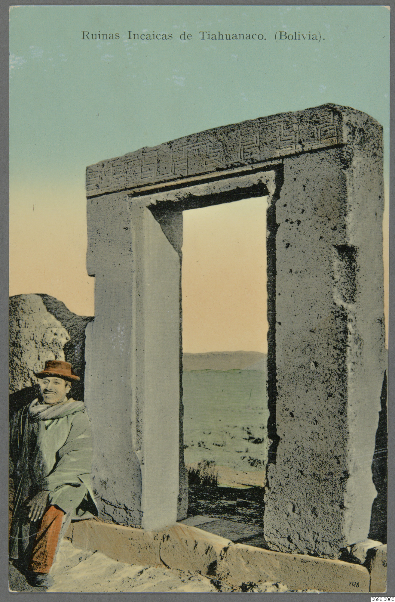 Vykort med kolorerad bild av man framför rektangulär stenport,ristade mönster på toppen av porten, grönt landskap skymtar i bakgrunden genom öppningen. Inkaruiner i Tiwanaku; arkeologisk plats. Bolivia, Amerika. Text på framsida: "Ruinas Incaicas de Tiahuanaco (Bolivia.)" Text på baksida: "UNION POSTALE UNIVERSELLE, Carte postale - Tarjeta Postal, Correspondencia, Direccion, A. … , No. 94. E. POLACK-S - Fotografos G. MORGENROTH & Cia, LIMA - PERÚ"