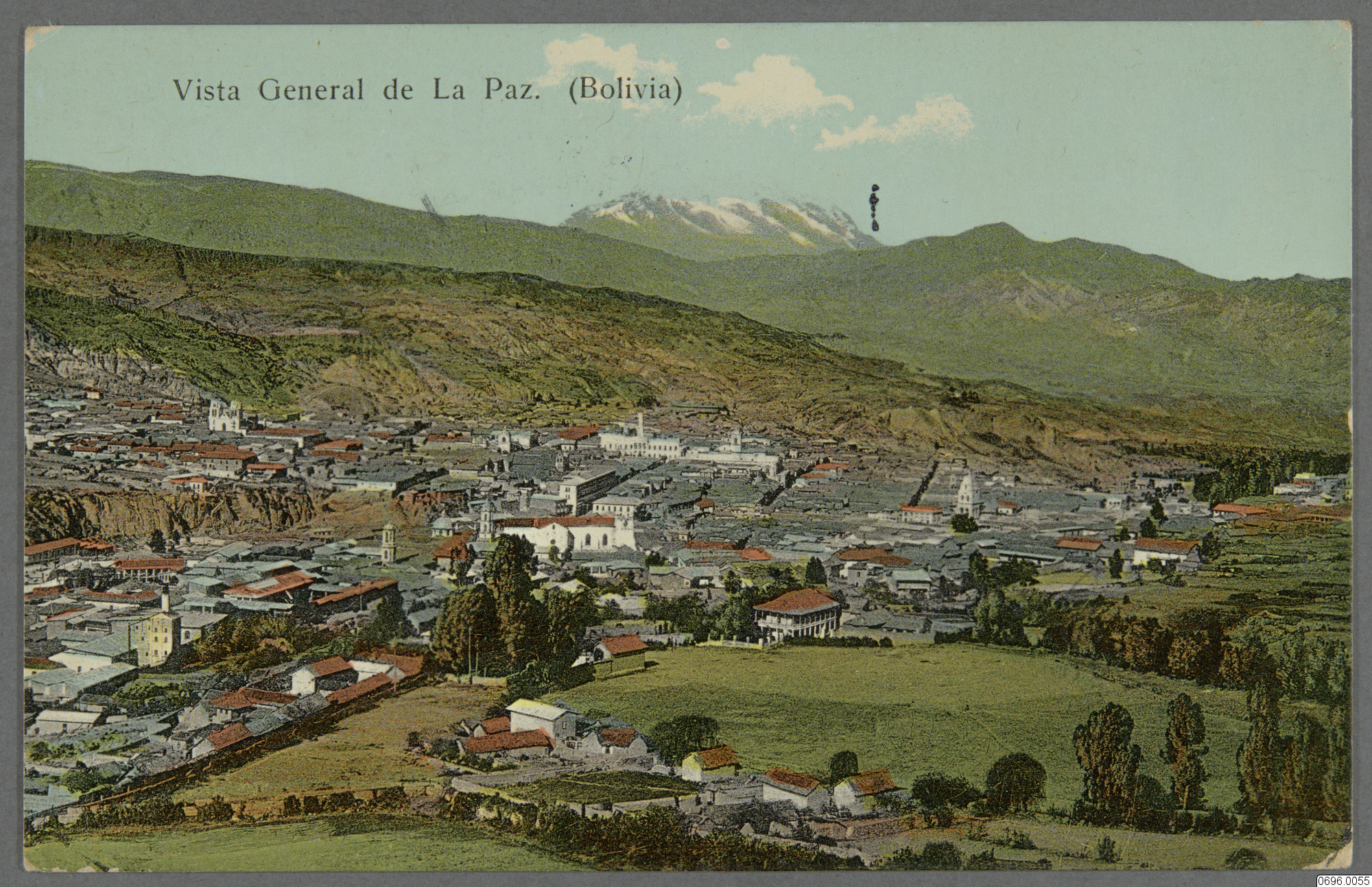 Vykort med kolorerad bild av stadsvy, tättplacerade byggnader, omgivande kuperat grönt landskap, berg med snöklädda toppar skymtande i bakgrunden. Utsikt över staden La Paz. Bolivia, Amerika. Text på framsida: "Vista General de La Paz. (Bolivia.) Text på baksida: "TARJETA POSTAL UNIVERSAL, Bolivia, González y Medina. La Paz, Oruro, Cochabamba, y Potosí. Editores., La Paz 16/10 1916, Käraste Anna, lämnar morgon middag La Paz oläsligt Lördag morgon oläsligt för att gå ombord oläsligt till San Francisco. Allt väl. Hälsningar oläsligt Wilhelm (?) , Doktorinnan Fru Anna Sandberg, Sturegatan 3 IV, Stockholm, Suecia, Eruopa."