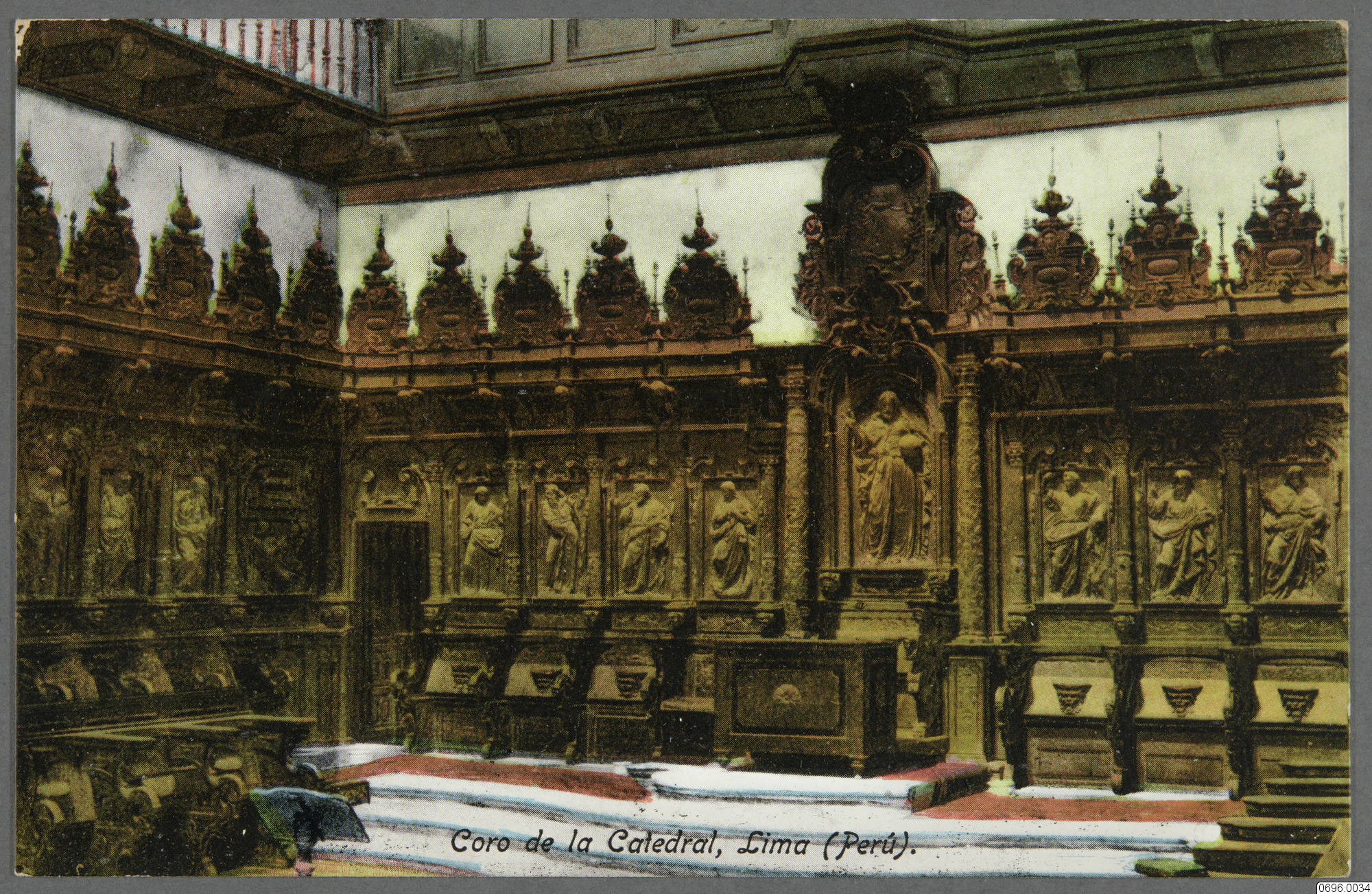 Vykort med kolorerad bild av interiör i kyrka, sal med flertalet skuplterade människofigurer på rad, vita trappsteg leder upp till podium, röd matta ligger under podiumet och sträcker sig ned över översta trappsteget, öppning in till salen längst till vänster. Körsal i katedral. Lima, Peru, Amerika. Text på framsida: "Coro de la Catedral, Lima (Perú)." Text på baksida: "Tarjeta postal, Correspondencia, Dirección, STGE, M. N. Benavides, Lima (Perú). No. 6, SR..."