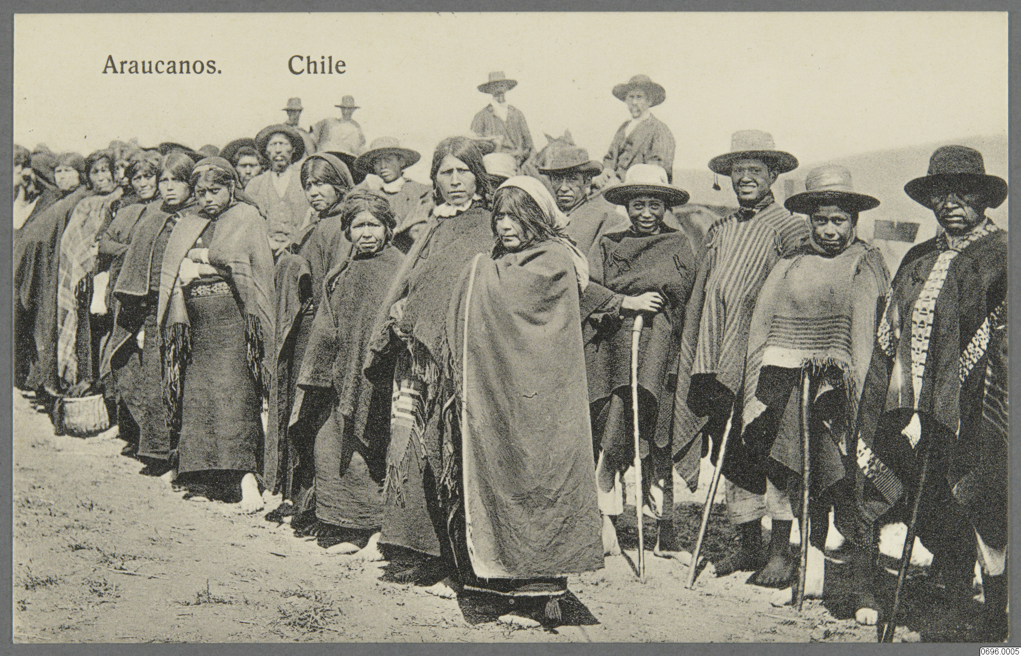 Vykort med porträtt av en grupp människor i mantlar, ponchos och hattar, kvinnor samt män tittar in i kameran, några män har käpp, flera kvinnor har huvudskynke. Mapuchefolk; urinvånare från Chile. Amerika. Text på framsida: "Araucanos. Chile." Text på baksida: "(Comunicaciones) Tarjeta Postal (Solo para la Direccion) Propriedad de Hume y Ca, Ahumada 357."