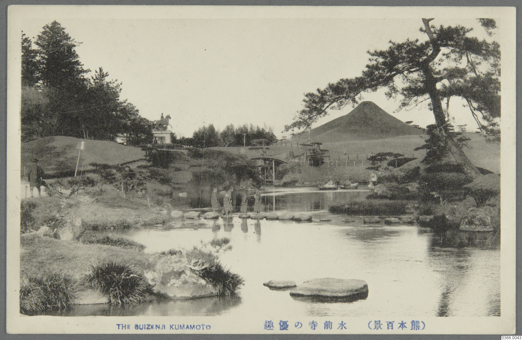 Vykort med motiv av människor som balanserar på stenar i vatten, landskap av gräs som når vattnet, träd och kuperat landskap i bakgrunden, staty av man till häst på stenpod med människor framför, samt människa stående till vänster vid vägkant. Suizenji Jojuen; landskapsträdgård i Kumamoto, Kyushu, Japan. Text på framsida: "THE SUIZENJI KUMAMOTO, Text på annat språk." Text på baksida: "CARTE POSTALE, Text på annat språk."