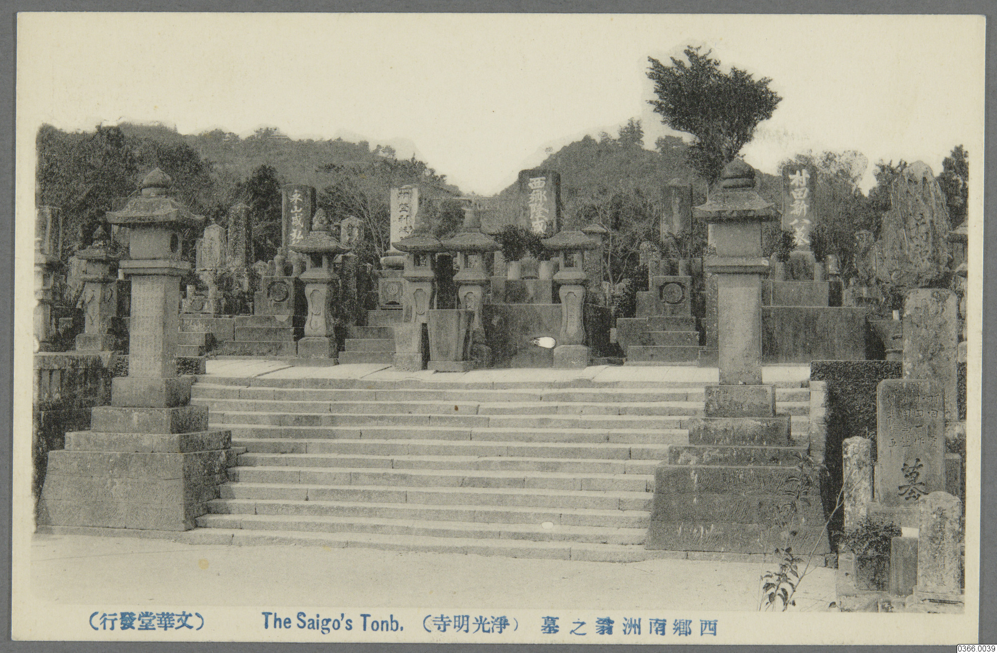Vykort med motiv av trappor kantade av - och som leder upp till gravstenar, träd i bakgrunden. Saigõ Takamoris grav; en av de mest inflytelserika samurajer som levt. Nanshu gravplats, Kagoshima, Japan." Text på framsida: "Text på annat språk, The Saigo's Tonb. Text på annat språk." Text på baksida: "POST CARD, Text på annat språk."