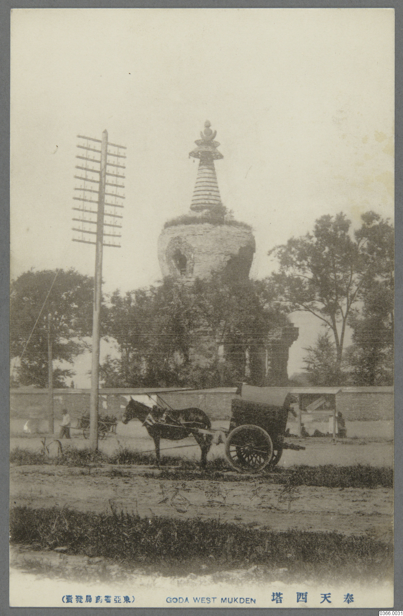 Vykort med motiv av häst förspänd till vagn invid väg, man med vagn bakom till vänster, lyktstolpe, mur i bakgrunden med elnät ovanför, framför byggnad, med kupolformad överdel med spets, som sticker upp bakom träd. Vy från västra Shenyang, Kina. Text på framsida: "Text på annat språk, GODA WEST MUKDEN, Text på annat språk." Text på baksida: "CARTE POSTALE, UNION POSTALE UNIVERSELLE. Text på annat språk."