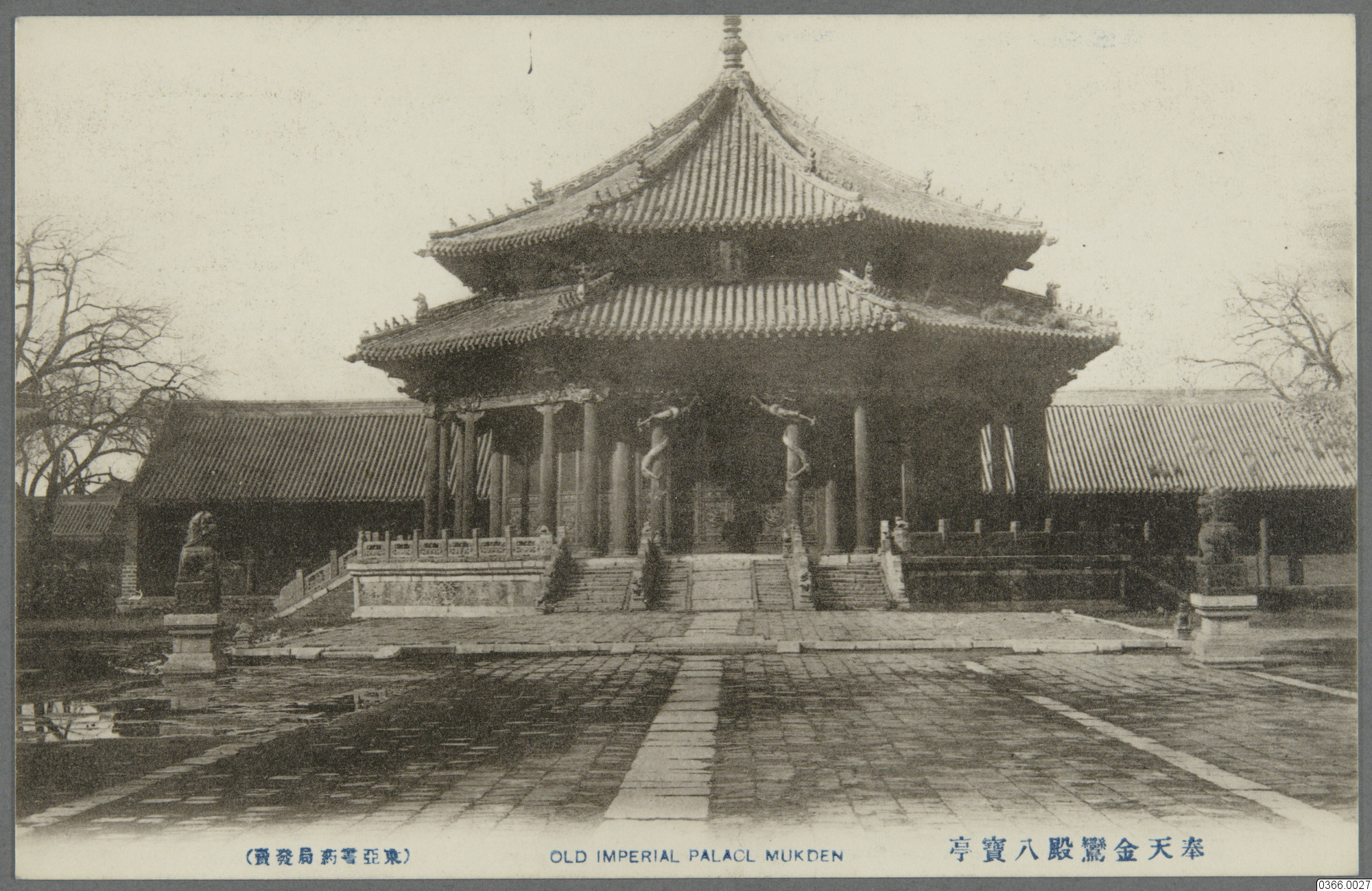 Vykort med motiv av central byggnad med spetsigt tak i två lager, trappor som leder upp, snirkliga figurer uppe vid ingången, stenväg framför. Dazheng hall - tidigaste byggnaden i Shenyangpalatset, Text på framsida: "OLD IMPERIAL PALACL MUKDEN, text på annat språk." Text på baksida: "CARTE POSTALE, UNION POSTALE UNIVERSELLE. Text på annat språk."