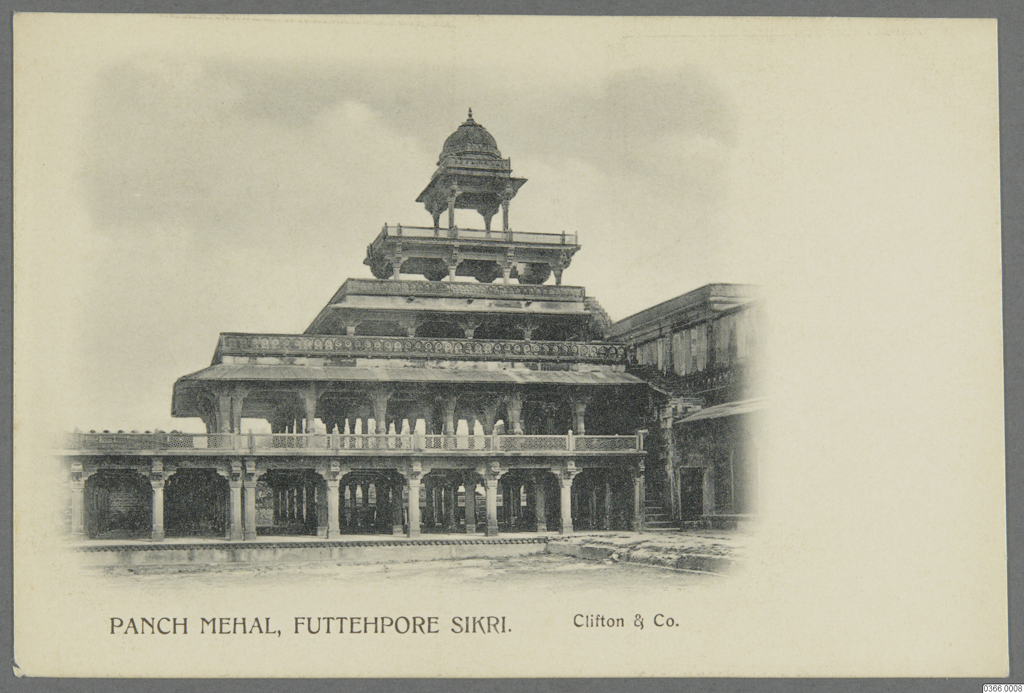 Vykort med motiv av ett palats med fyra våningar, uppbyggd av pelare. Palatset Panch Mahal. Fatehpur Sikri, Agra, Uttar Pradesh, Indien. Text på framsida: "PANCH MEHAL, FUTTEHPORE SIKRI. Clifton & Co." Text på baksida: "UNIVERSAL POSTAL UNION - UNION POSTALE UNIVERSELLE, BRITISH INDIA, INDE BRITANNIQUE, POST CARD - CARTE POSTALE, THE ADDRESS ONLY TO BE WRITTEN ON THIS SIDE."