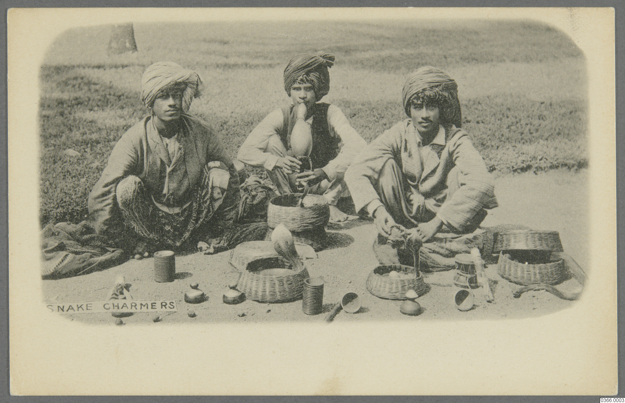 Vykort med motiv av tre män sittandes på marken med ormar i korgar, en spelandes det indiska instrumentet kallat pungi, ormtjusare. Text på framsida: "SNAKE CHARMERS." Text på baksida: "POST CARD, THE ADDRESS TO BE WRITTEN ON THIS SIDE."