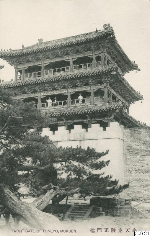 Vykort med motiv av byggnad bakom hög mur, tre människor på ena våningen, träd samt trappa i förgrunden. Byggnad i Shenyang, Kina. Text på framsida: "FRONT GATE OF TONLYO, MUKDEN, Text på annat språk." Text på baksida: "UNION POSTALE UNIVERSELLE, CARTE POSTALE, CORRESPONDENCE, ADDRESS, TOKYO DESIGN PRINTING, TRADE MARK, KANDA, TOKYO, Text på annat språk."