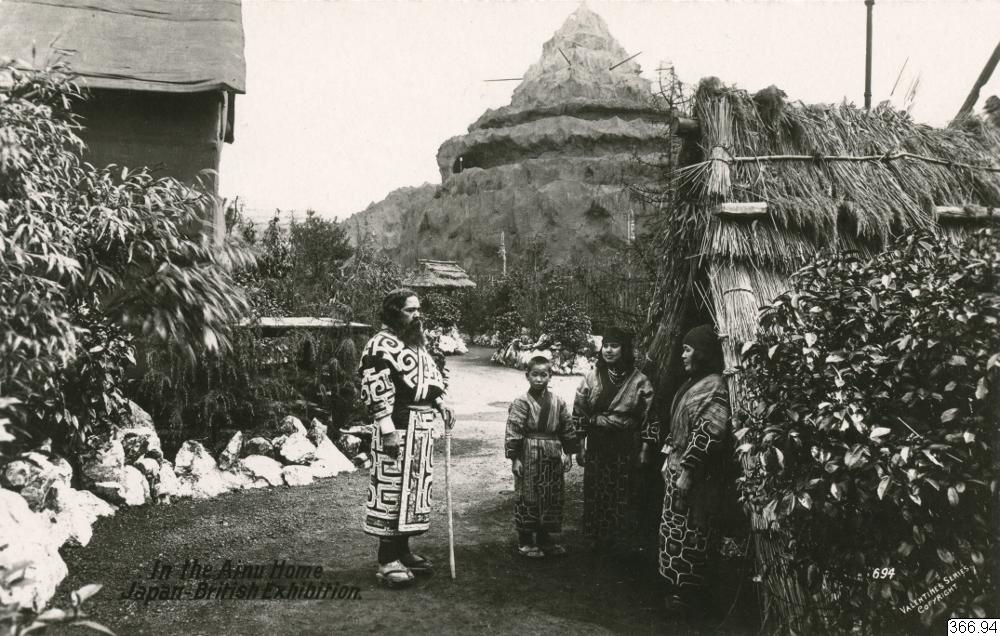 Vykort med motiv av man, klädd i snirkligt mönster, ståendes framför ett barn och två kvinnor i liknande klädsel, framför en hydda, andra byggnader i bakgrunden, växtlighet på sidorna med stenar som håller vägen fri från dem. Vy från Japansk - Brittisk utställning med Ainufolkets hem - inhemskt folk från norra Japan. från Text på framsida: "In the Ainu Home, Japan - British Exhibition." Text på baksida: "JAPAN BRITISH EXHIBTION, OFFICIAL, POST CARD, Correspondence, Address, VALENTINE'S SERIES, Printed by Valentine & Sons Ltd Dundee, London& New York."