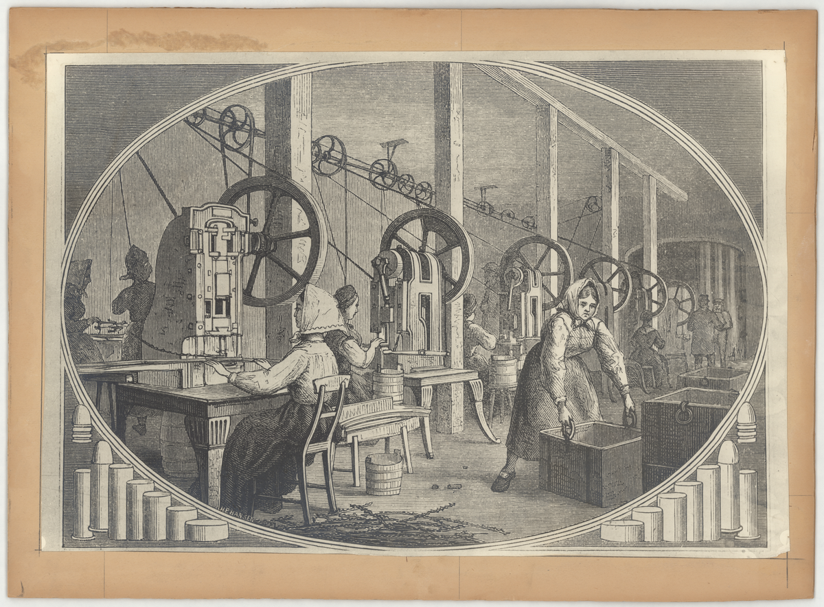 Plansch med interiör från Mariebergs ammunitionsfabrik. Tillverkning av patron m/1868 för Remingtongevär. Teckning ur Svenska Familjejournalen, 1873.