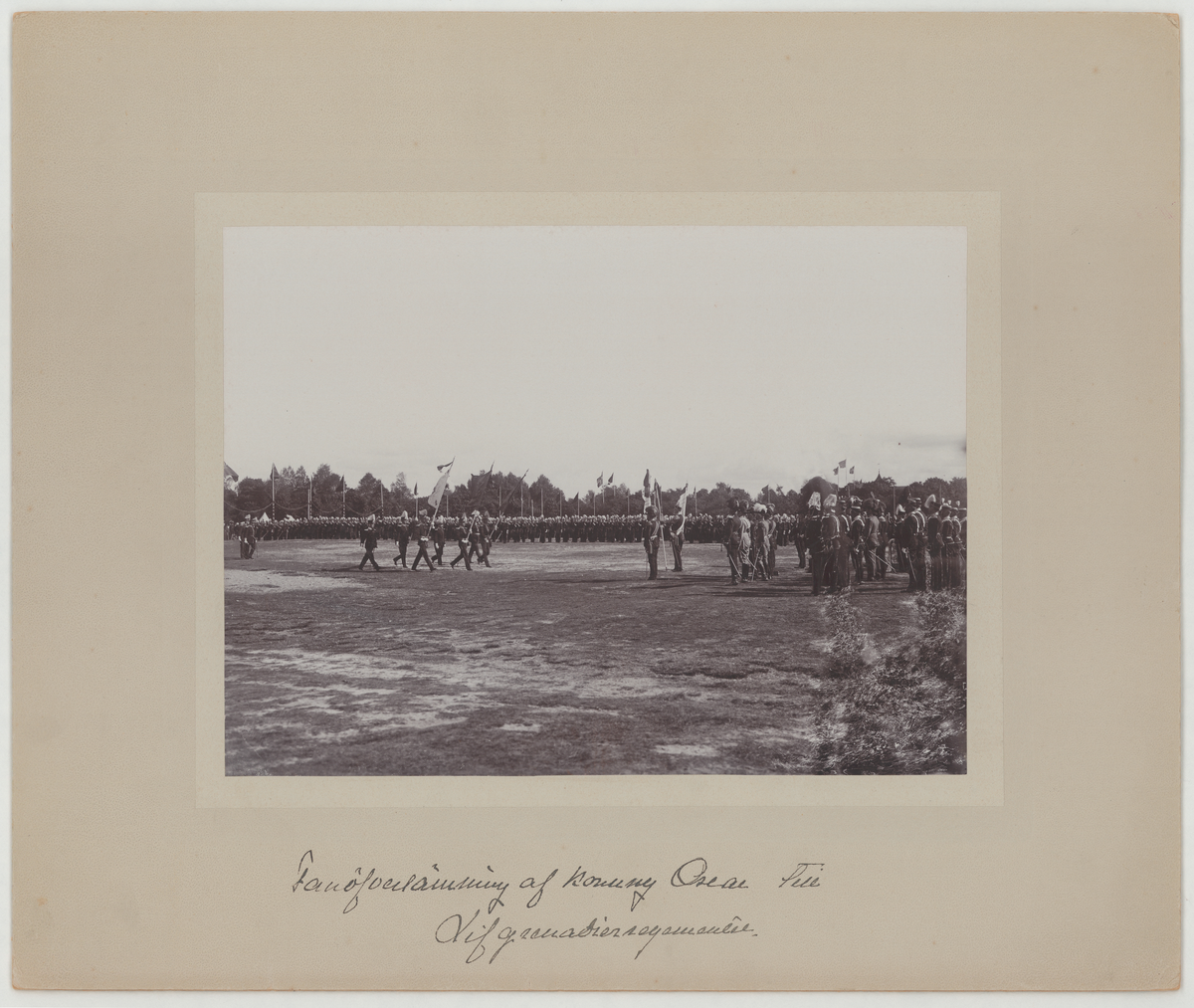 Titel: Kung Oscar överlämnar fana till Livgrenadjärregementet I 4.
