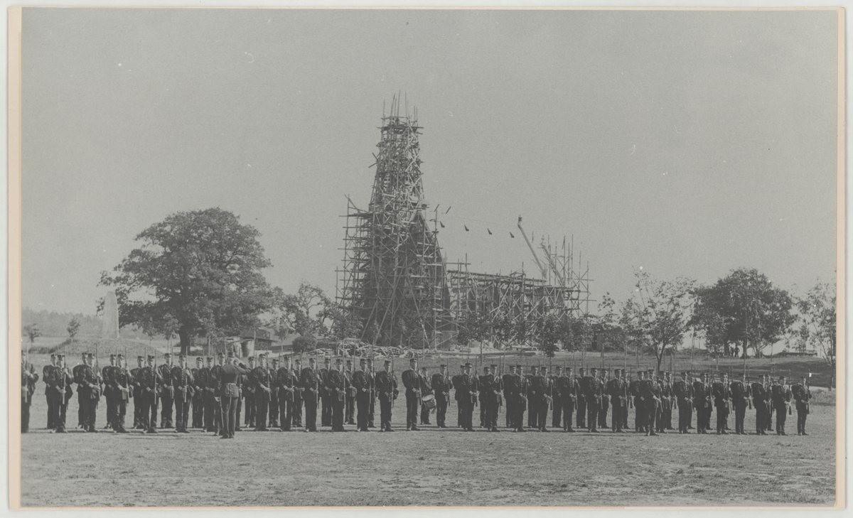 Svea livgarde genomför militär fysisk träning. Uppställning med vapen framför en kyrka inhägnad av byggnadsställningar, ca 1890.