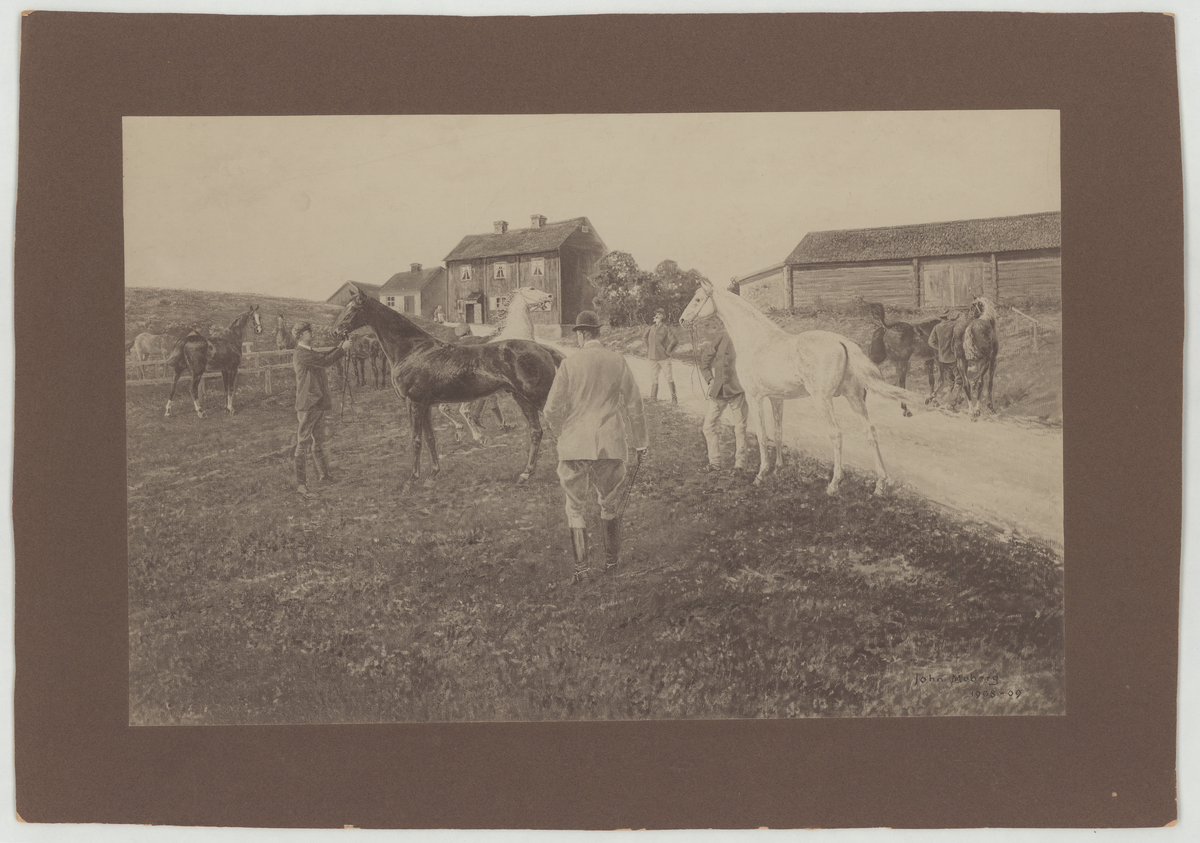 Civila män tar hand om hästar på en gård, 19081909. Teckning av John Moberg.