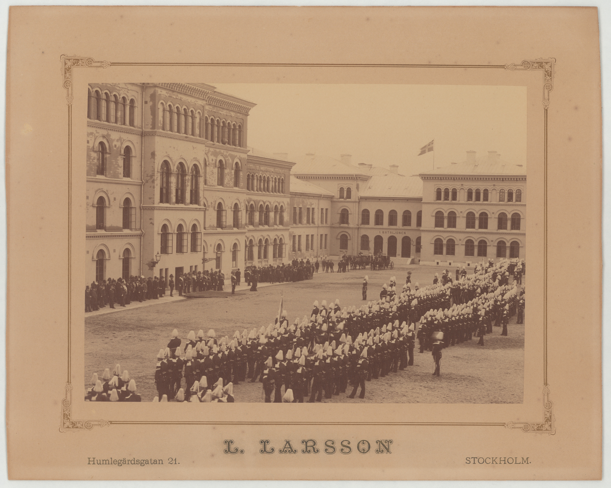 Livregementet till häst (K 1?), uppställning på kaserngård.