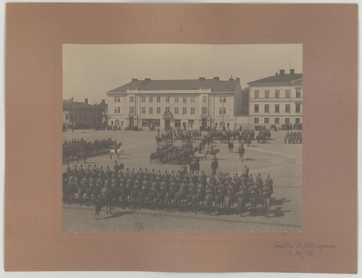 Titel: Tavastehus ryttarregemente. Beriden trupp paraderar på stenlagt torg med ny fana.