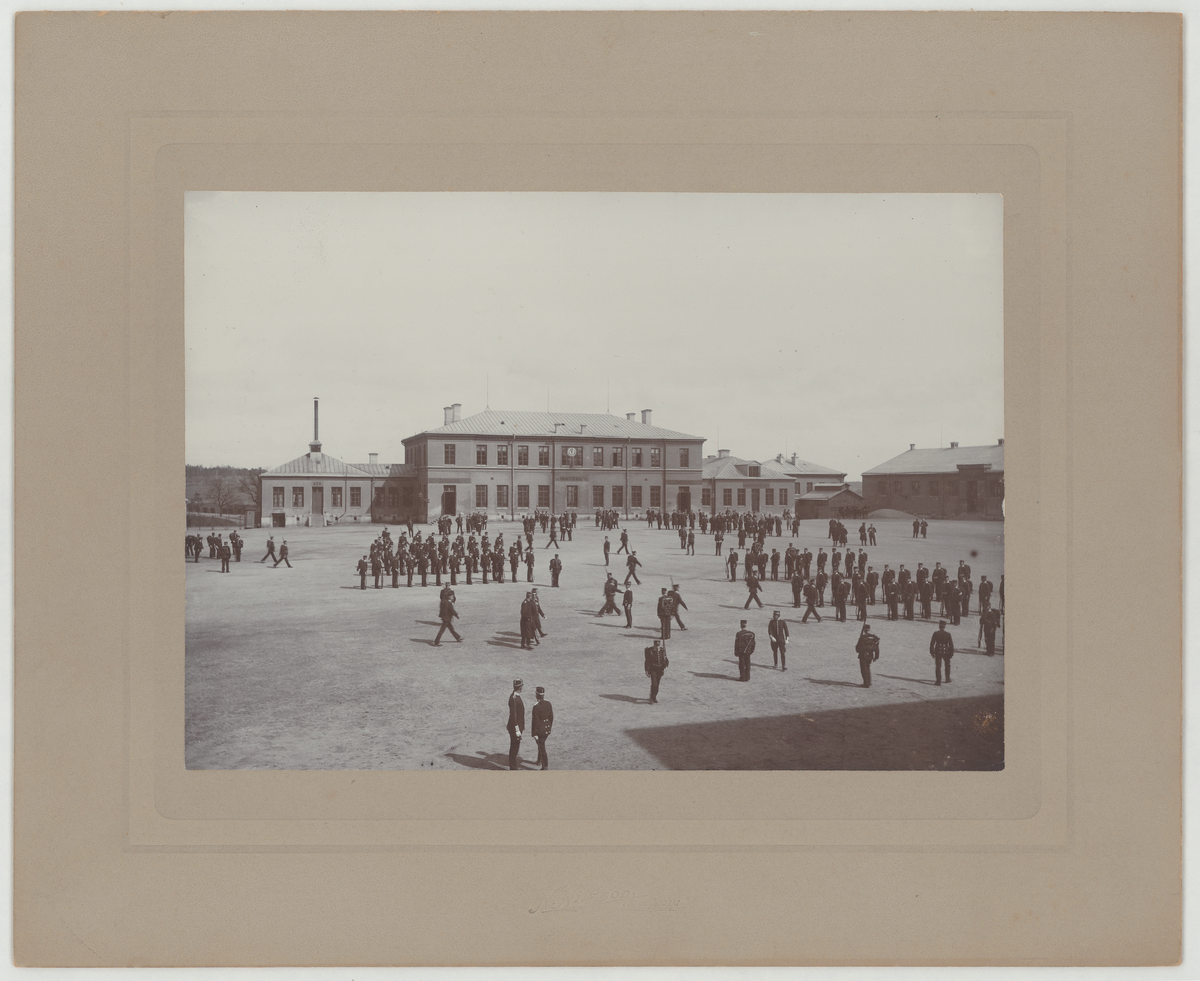 Göta livgarde I 1, förbimarsch på kaserngården vid kronprinsens (senare Gustaf V) inspektion, 1901.