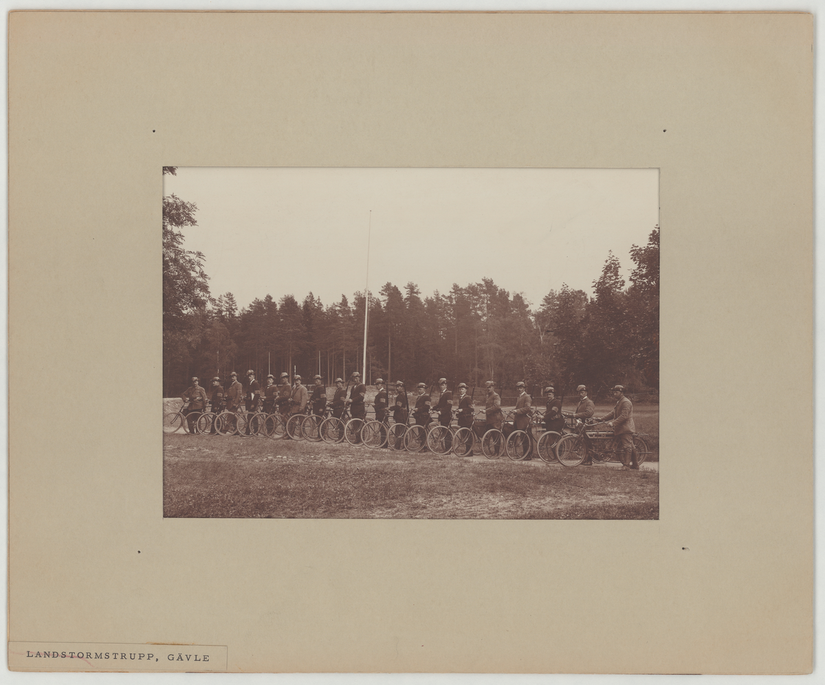 Titel: Landstormstrupp med cyklar uppställd vid ett fält i Gävle.
