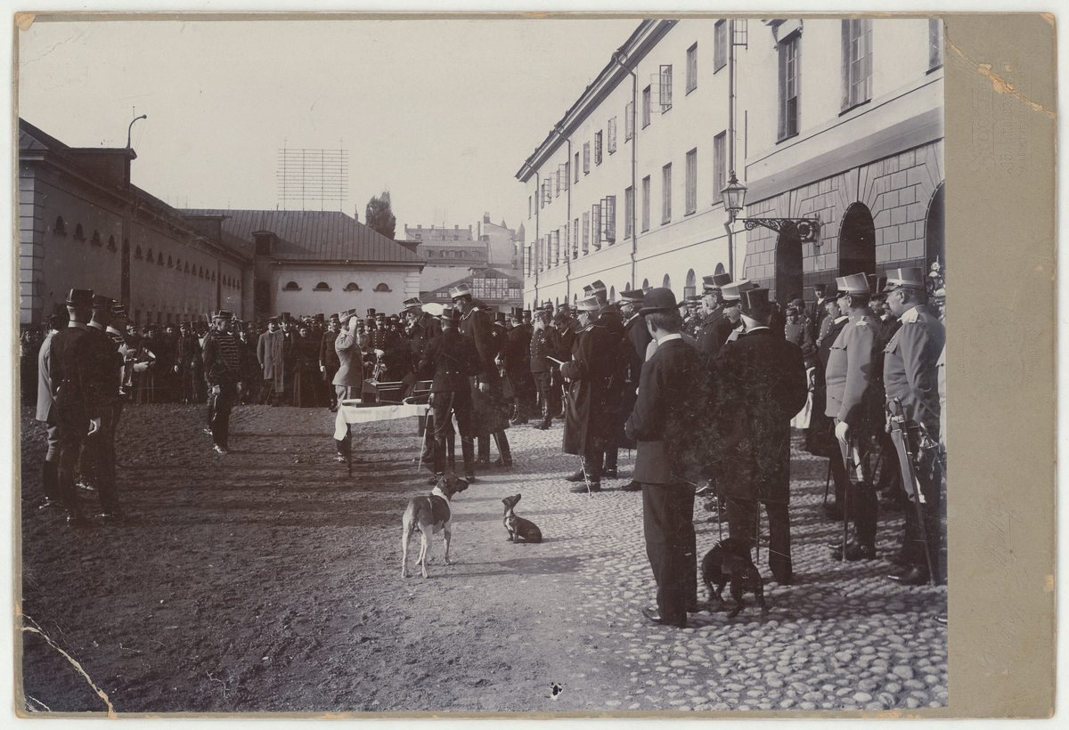 Livgardet till häst utanför kasernen på Storgatan, Stockholm. Bild tagen mellan 18951897.