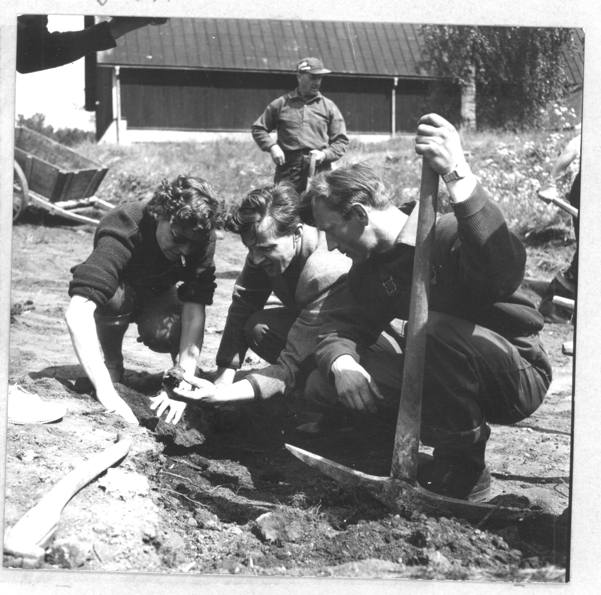 Gudsberga kloster, Husby socken. Undersökningen av Gudsberga klosterruin började vid den södra muren. På bilden antikvarie Ingrid Swartling, amanuens P. H. Rosenström och ä:s ombud C-E Eriksson.