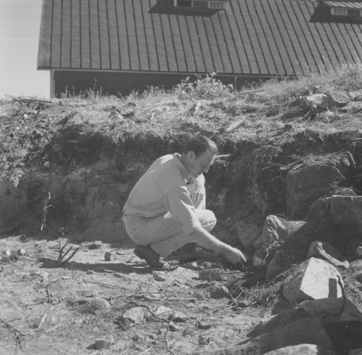 Gudsberga kloster, Husby socken. La Björn Hallerdt i arbete med framtagning av den låga muren intil altaret.