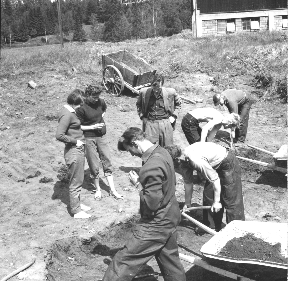 Titel: Gudsberga kloster, Husby socken. Undersökningen av Gudsberga klosterruin påbörjades den 10 juni 1959. Bild visar en av de första grävningsdagarna.