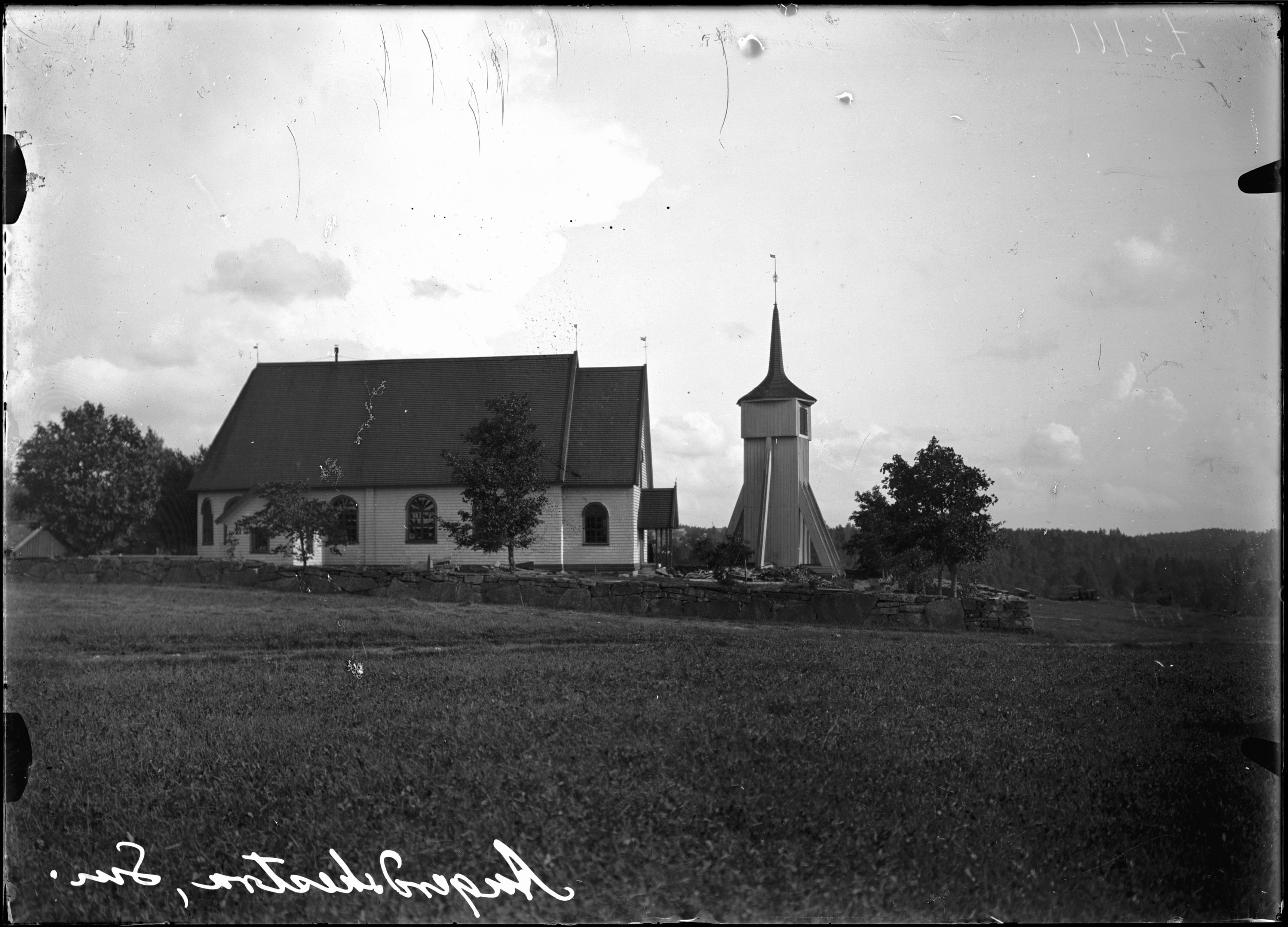 Kyrkan och klockstapeln från norr.