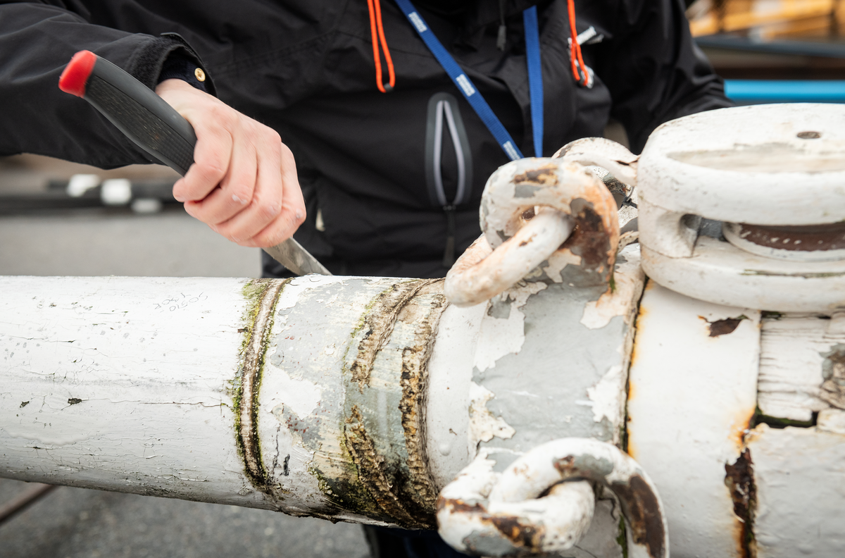 HMS Af Chapman, (vandrarhem) i docka, Beckholmen. Renoverar riggen.