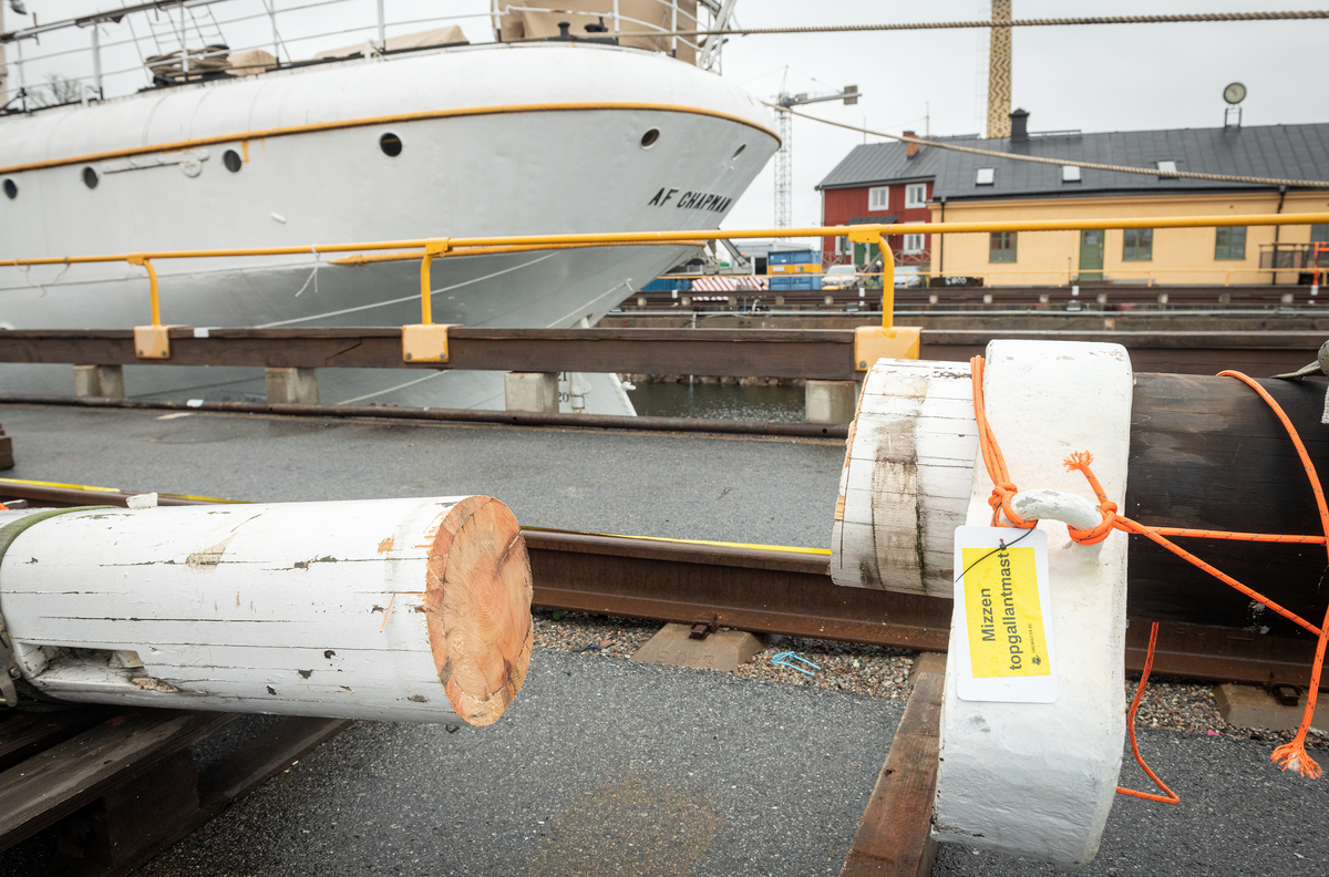 HMS Af Chapman, (vandrarhem) i docka, Beckholmen. Renoverar riggen.