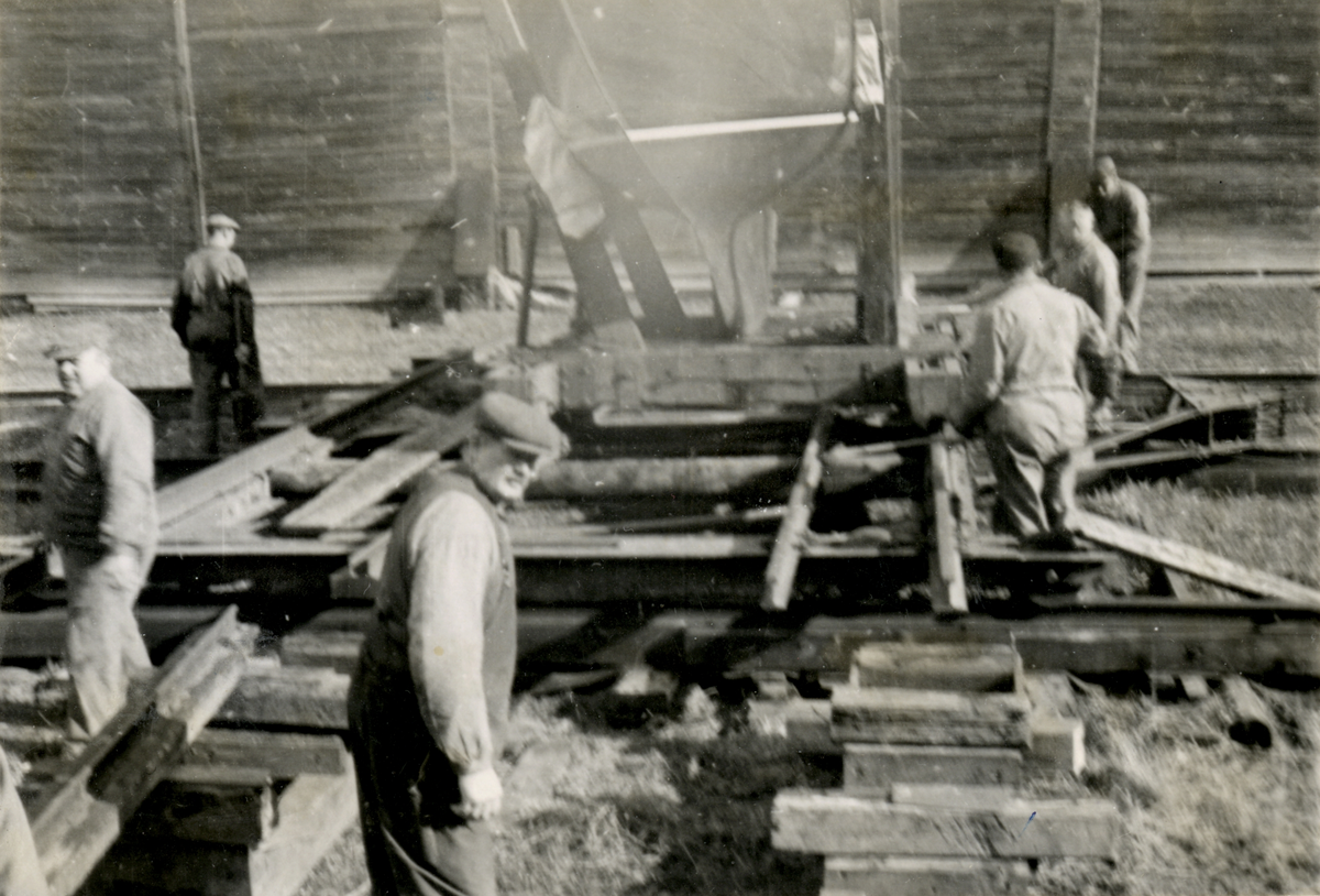 Fotografi ur Detlow von Brauns album. Sjösättning av med segelbåten DOTTE på Hästholmsvarvet.