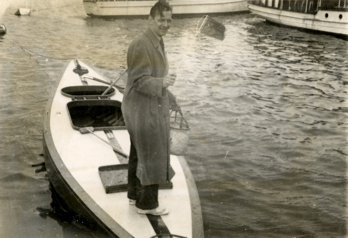 Fotografi ur Detlow von Brauns album. Bengt med Skothalarstanderten i ena handen och textilhink i andra handen vid sjösättningen av segelbåten DOTTE på Hästholmsvarvet.