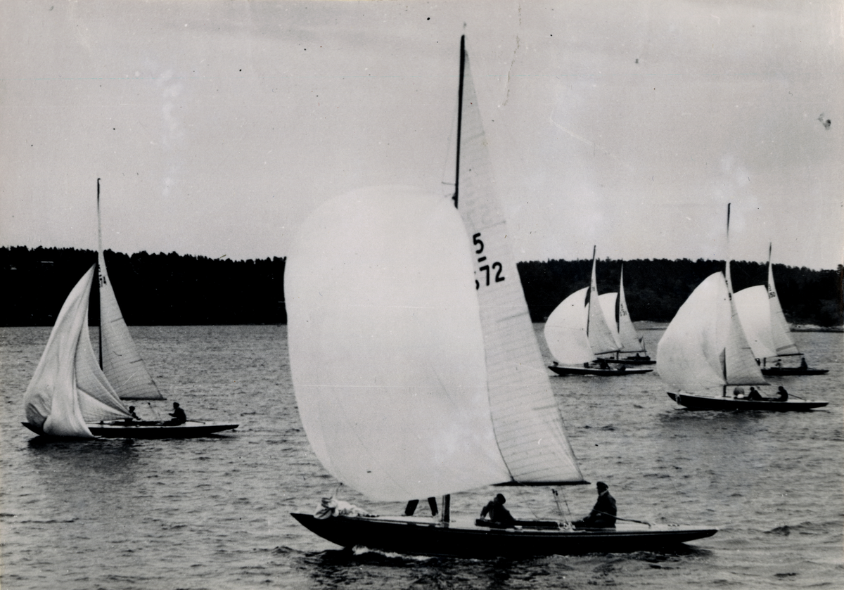 Fotografi ur Detlow von Brauns album. Segelbåten 5-S72 SUNNY under kappsegling.