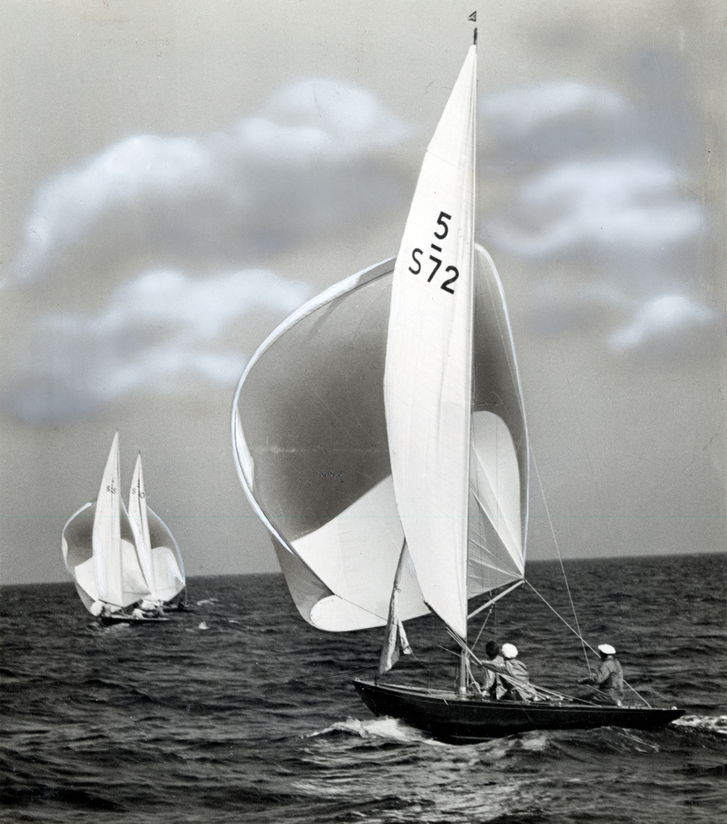 Fotografi ur Detlow von Brauns album. Segelbåten 5-S72 SUNNY under kappsegling med Gunnar "Bullen" Jacobsson som rorsman.