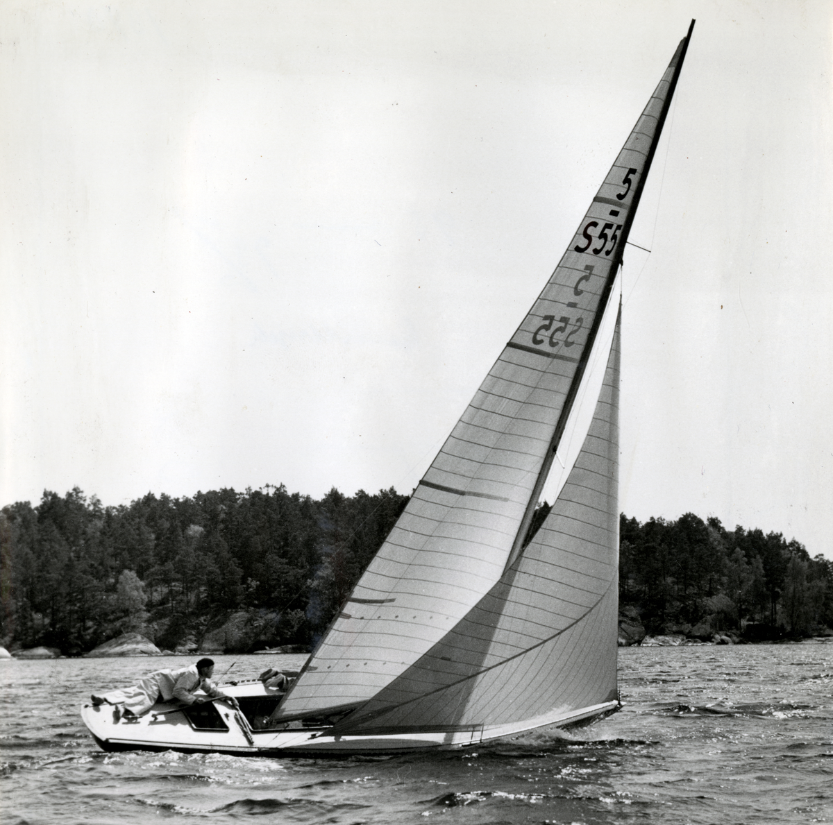 Fotografi ur Detlow von Brauns album. Intensiv kappsegling med 5-S55 SJÖRÅTTU. Rorsman Hjalmar Frisell på aktern.
