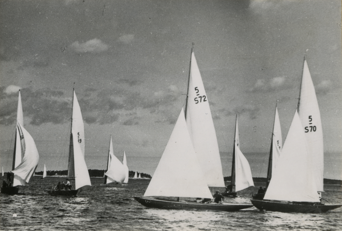 Fotografi ur Detlow von Brauns album. Segelbåten 5-S72 SUNNY seglar Sandhamnsregattan.