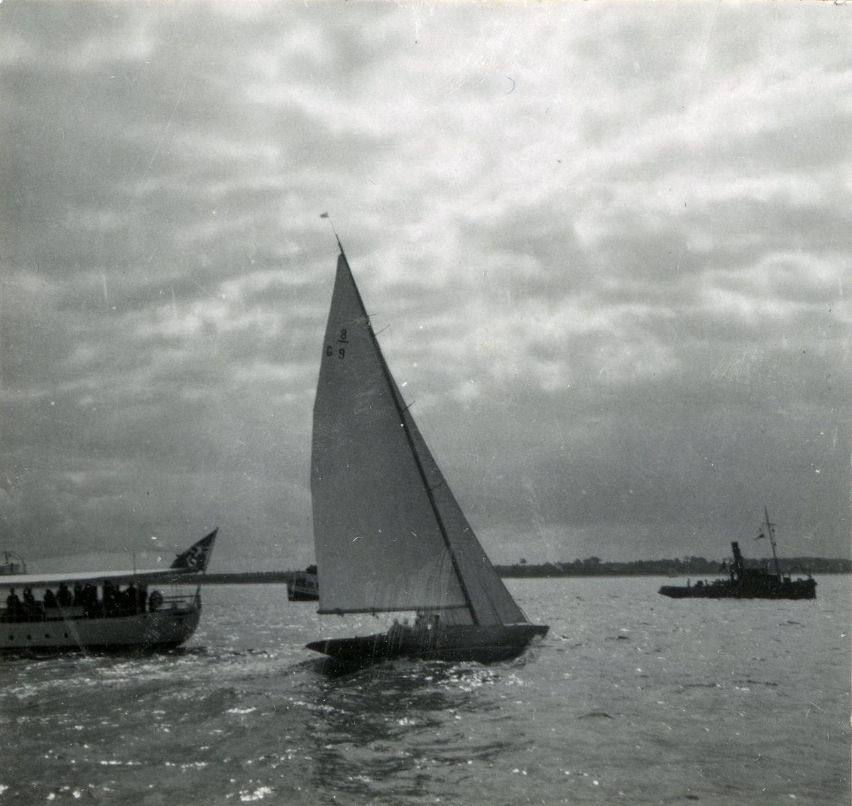 Fotografi ur Detlow von Brauns album. Segelbåten GERMANIA vid OS-seglingarna.