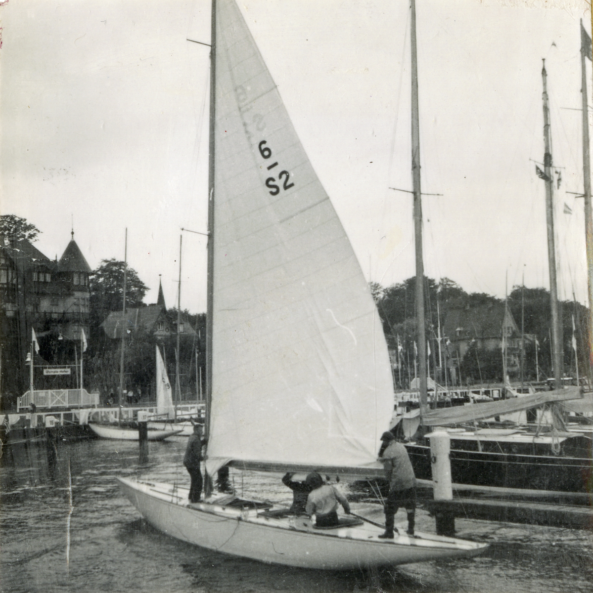 Fotografi ur Detlow von Brauns album. Segelbåten MAY BE med besättning vid OS-seglingarna..