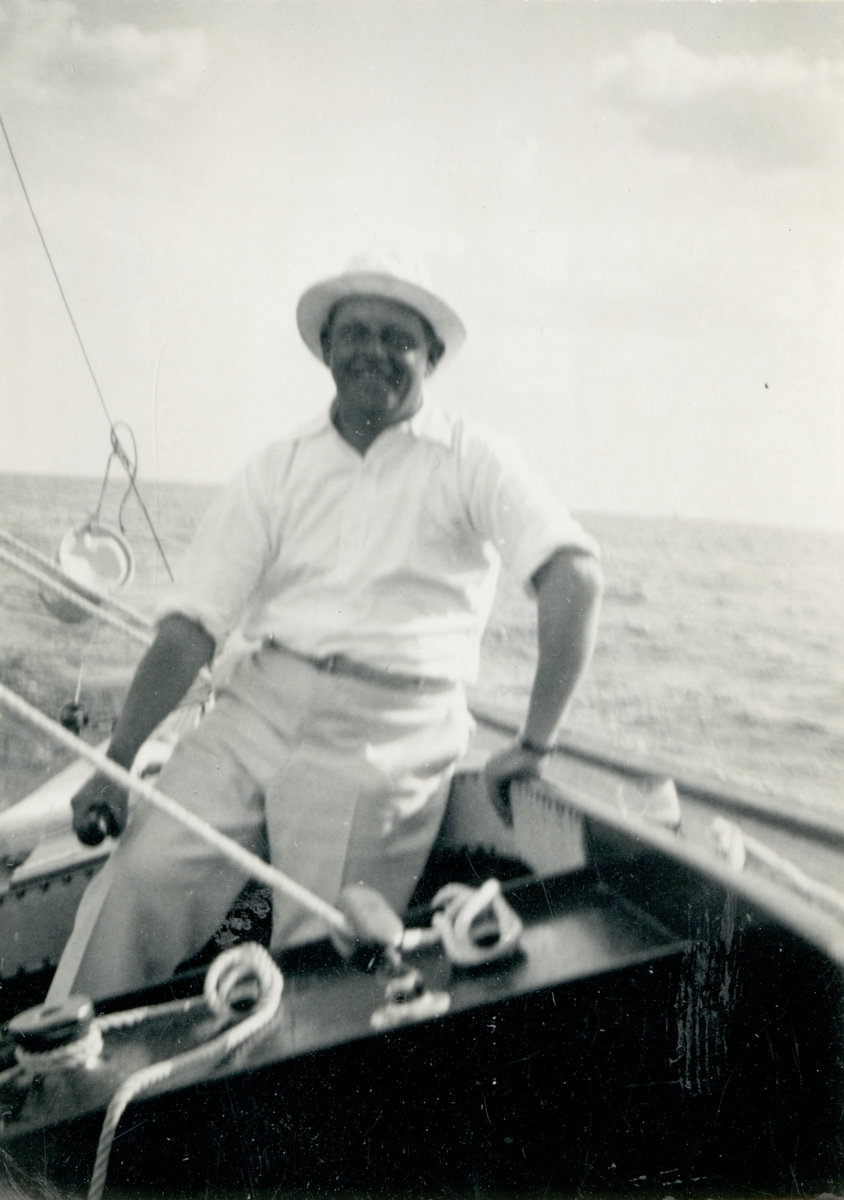Fotografi ur Detlow von Brauns album. Bernhard vid rodret under segling.