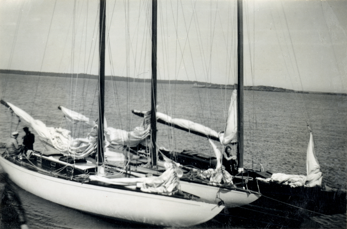 Fotografi ur Detlow von Brauns album. Segelbåtar och segelsällskap i naturhamn.
