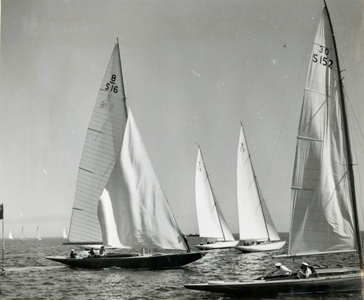 Fotografi ur Detlow von Brauns album. Segelbåtarna 8-S16, 8-S5, 8-S7 och 30-S152 rundar märke under regatta.