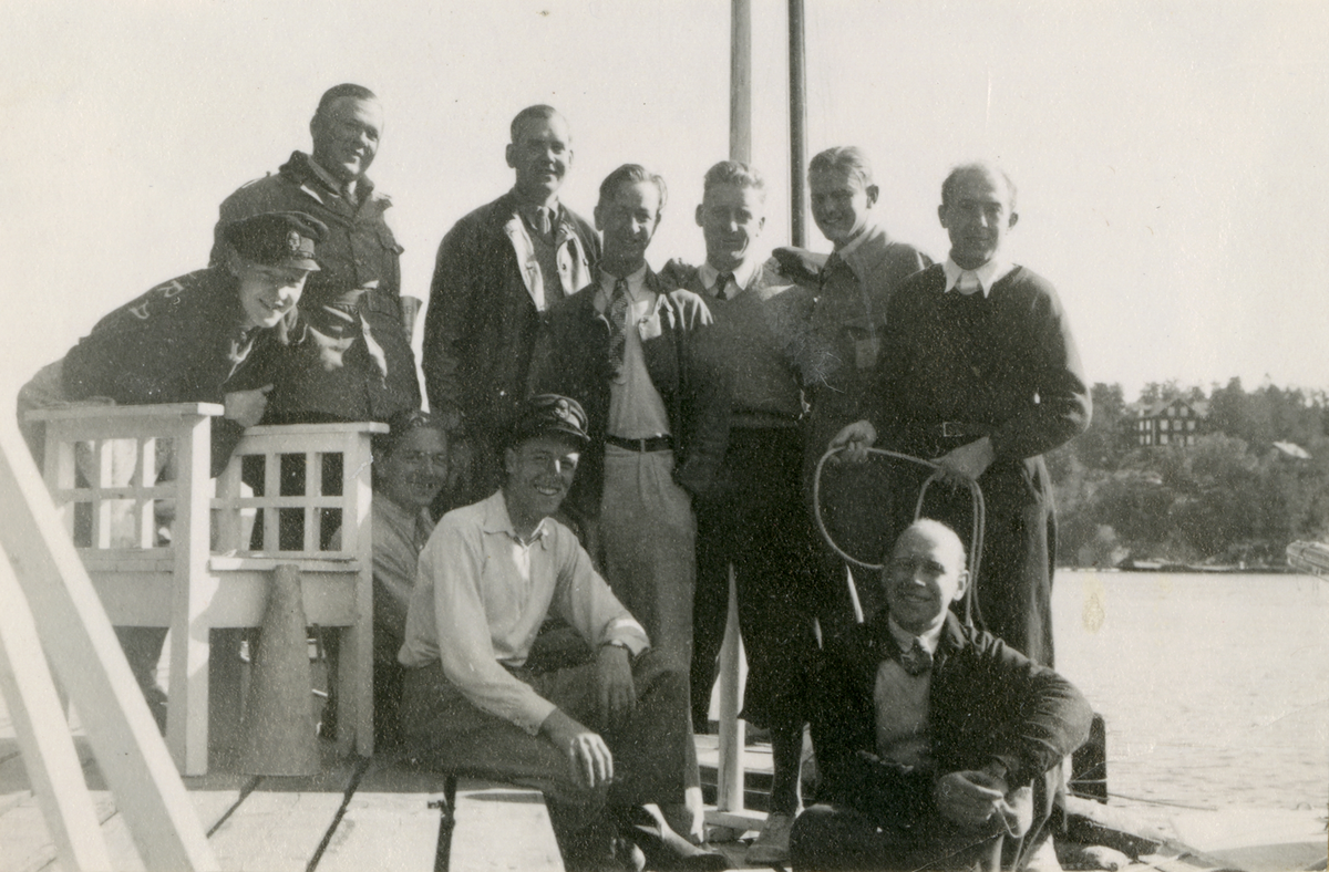 Fotografi ur Detlow von Brauns album. Gruppbild på segelsällskap under Skothalarmästerskapen.