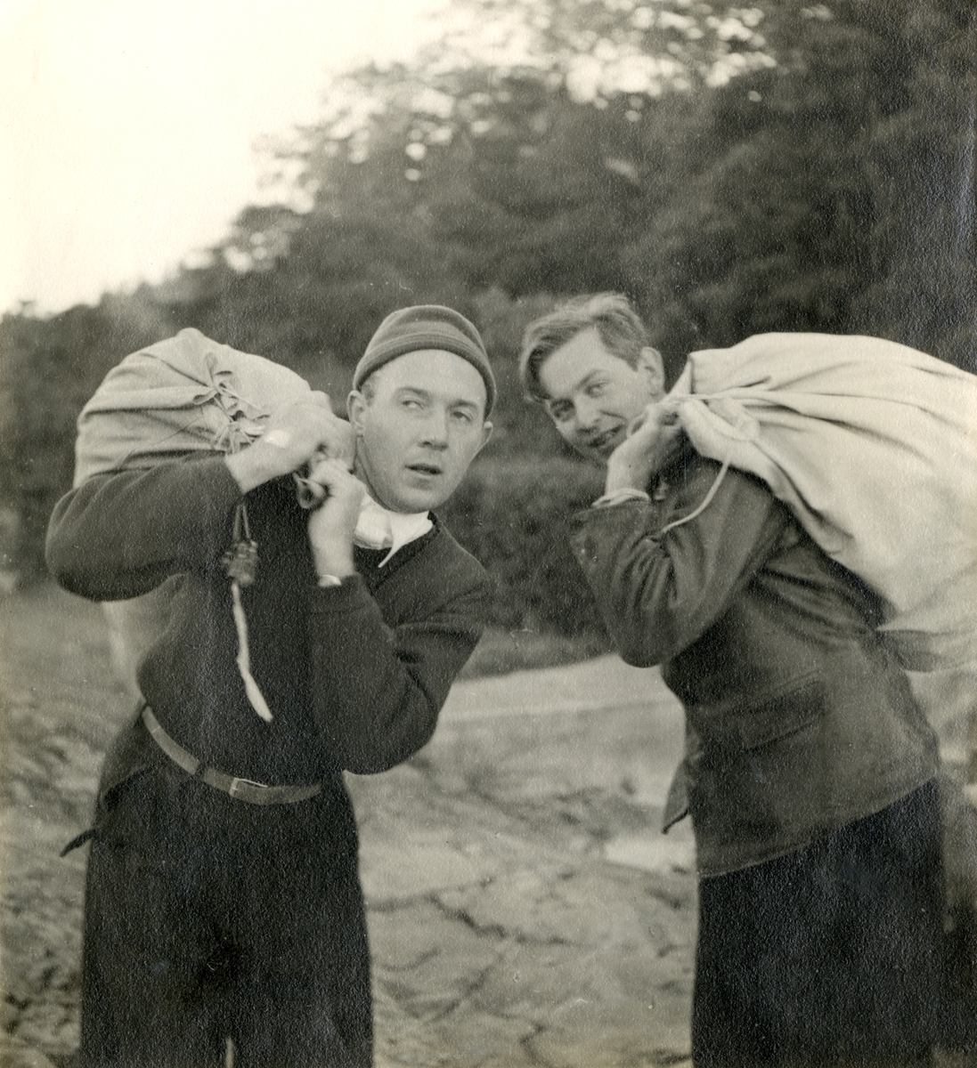 Fotografi ur Detlow von Brauns album. K-G och Bengt Reistad bär varsin segelsäck unser Skothalarmästerskapen.