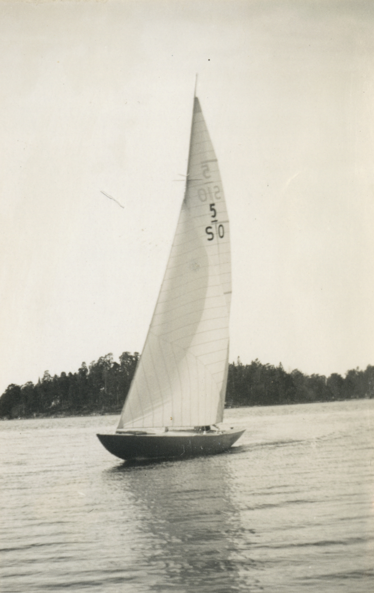 Titel: Fotografi ur Detlow von Brauns album. Segelbåten LA FEMME trimmas.