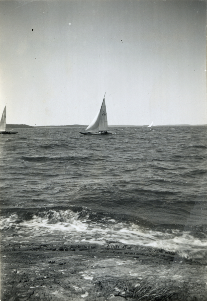 Fotografi ur Detlow von Brauns album. Segelbåten LA FEMME kappseglar på Björkfjärnen under SSS:s Midsommarregatta.